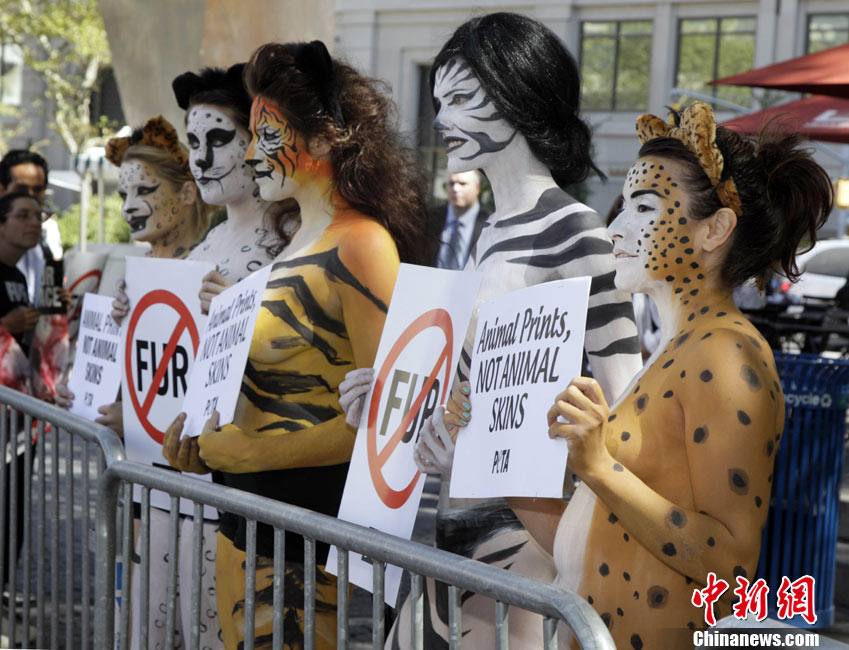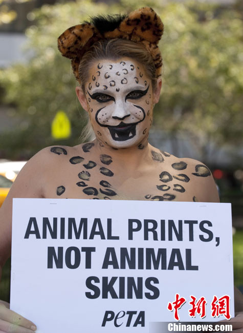 9月14日,在紐約時裝周進行期間,幾位環(huán)保愛好者在身上涂畫“動物彩繪”,呼吁保護動物,愛護環(huán)境。