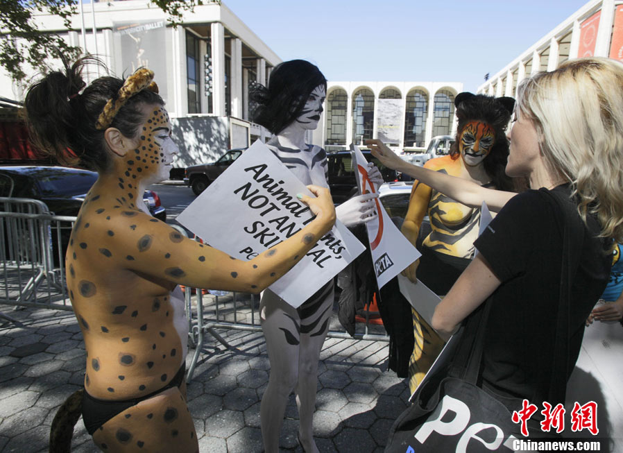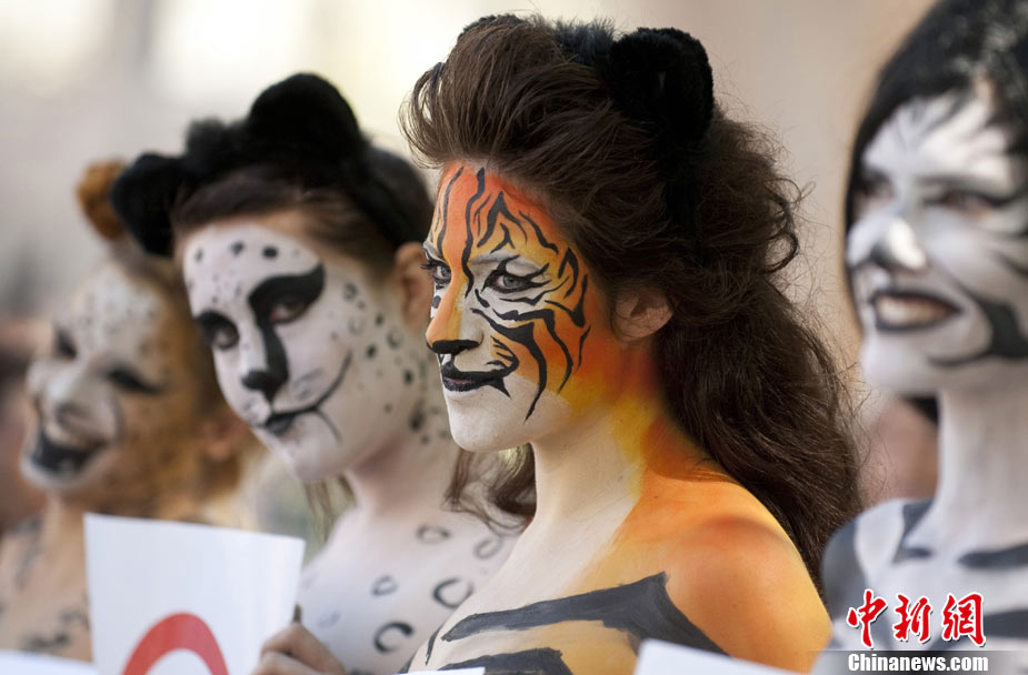 紐約時裝周美女身涂動物彩繪場外倡環(huán)保