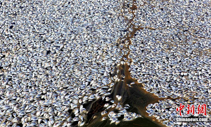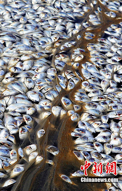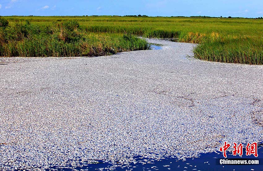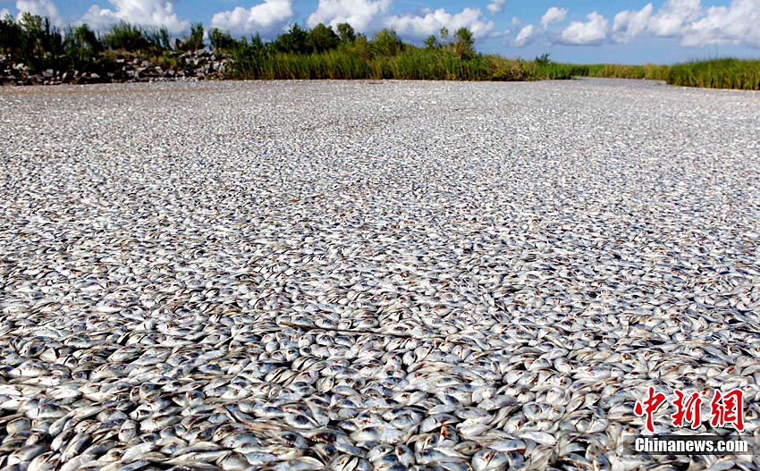 近日,人們?cè)诿绹芬姿拱材侵萜绽嗣骺h發(fā)現(xiàn)大批漂浮在緩流溪上的死亡魚群。目前,這批魚的死亡原因不明,但懷疑與墨西哥灣漏油事件有關(guān)。圖為9月10日在美國路易斯安那州普拉克明縣拍攝的大批死魚。