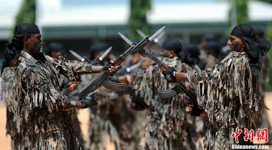 9月17日,在斯里蘭卡東北部城市亭可馬里舉行的空軍閱兵儀式上,116名空軍特種兵展示他們的各項技能。自2009年泰米爾猛虎組織(全稱,泰米爾·伊拉姆猛虎解放組織)的首領(lǐng)普拉巴卡蘭被擊斃,其基地被政府軍攻陷后,斯里蘭卡結(jié)束了長達(dá)25年的內(nèi)戰(zhàn),軍隊實力不斷增加。
