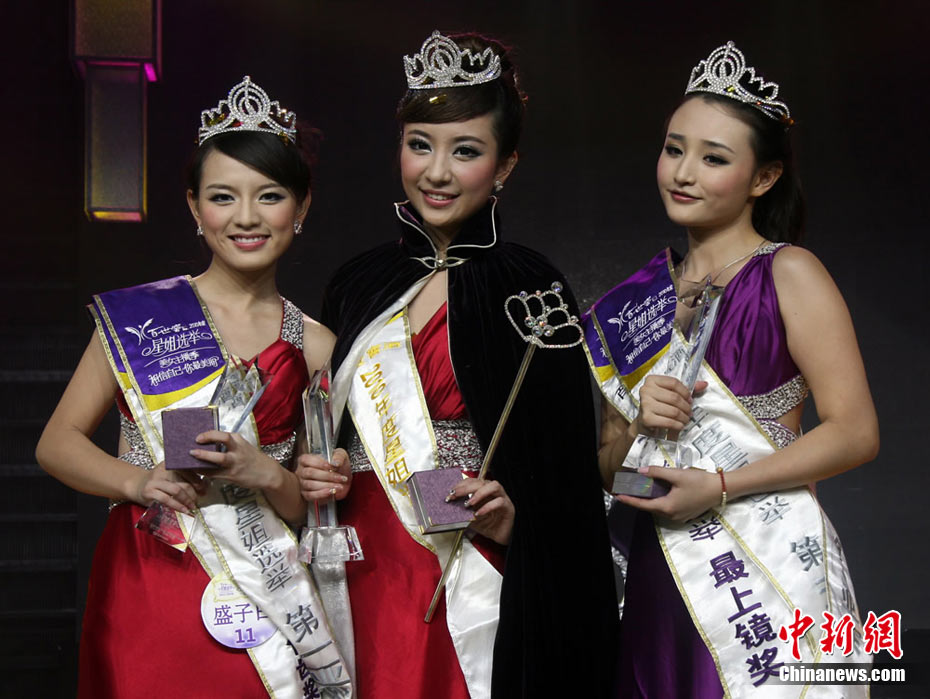 9月19日晚,歷時兩個多月的“2010年度星姐選舉”總決選在湖南長沙落下帷幕。長沙妹子晏維(中)笑到最后,一舉奪得本屆星姐總冠軍,盛子曰(左)和謝綠路分獲第一亞軍和第二亞軍稱號。鄧霞 攝