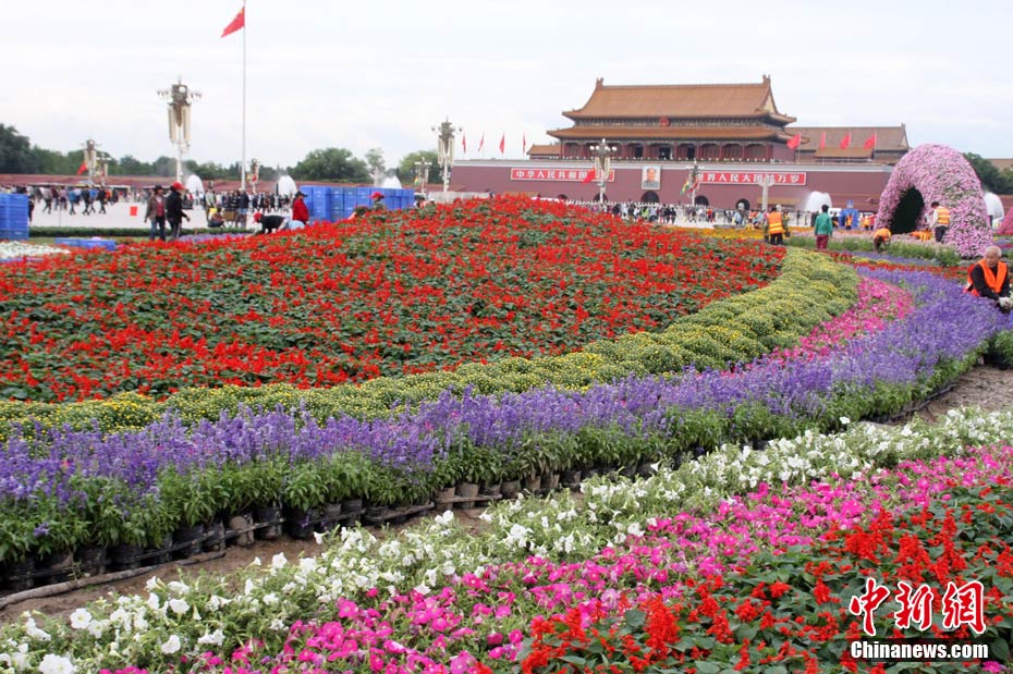 天安門國慶花壇中秋前夜試燈