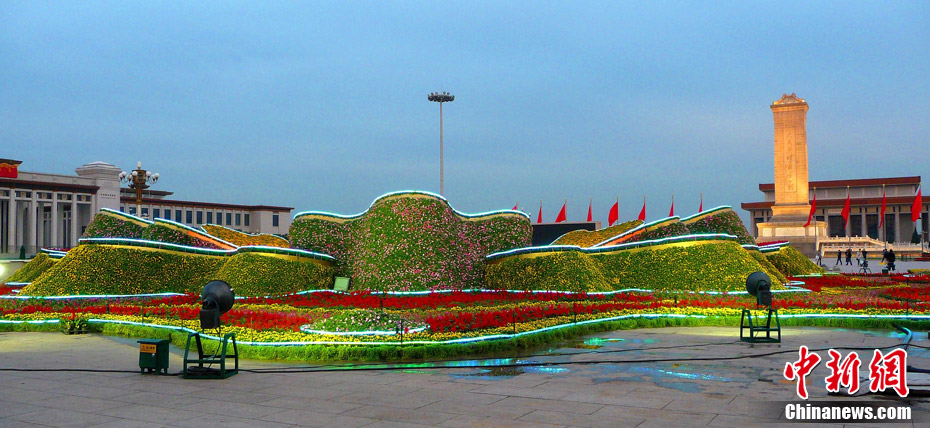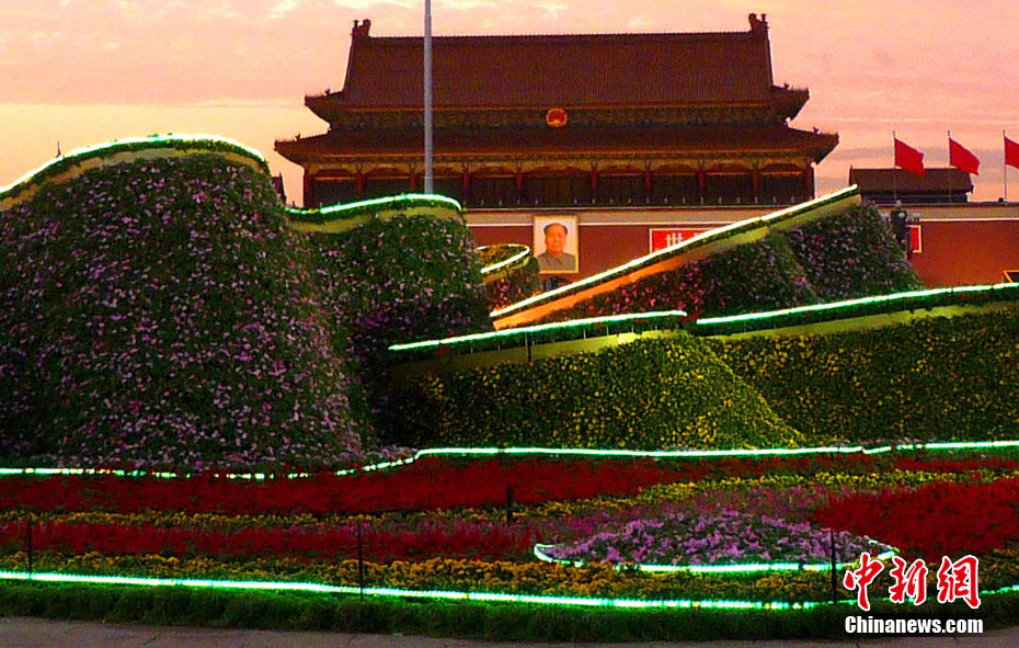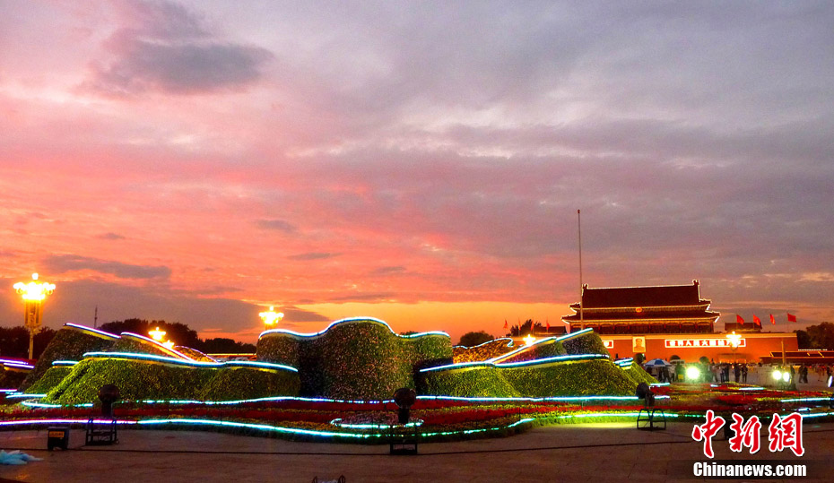 9月21日傍晚,北京天安門廣場,剛剛布置完畢的國慶中心花壇首次調試景觀照明,綻放的“牡丹”與晚霞交相輝映。 中新社發(fā) 玉龍 攝 圖片來源:cnsphoto