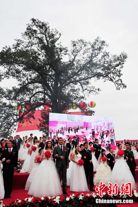 9月22日中秋佳節(jié)之際,99對參與過抗震救災(zāi)及災(zāi)后重建的新人,在四川省什邡市紅豆村的千年紅豆樹下,互許終身,共慶婚禮。圖為新人們在千年紅豆樹下見證愛情,同拋新娘捧花。中新社發(fā) 安源 攝