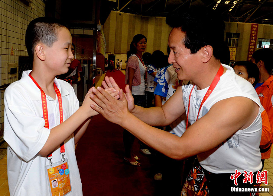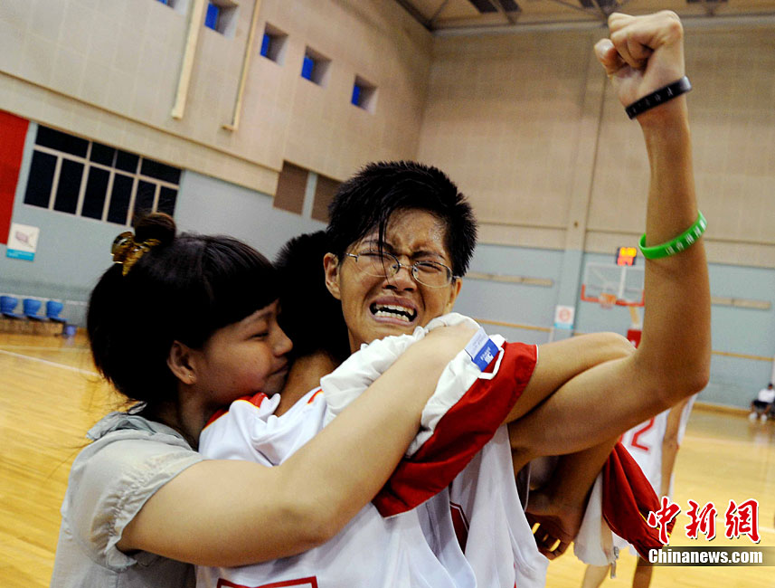 9月24日,在本屆特奧運(yùn)動(dòng)會(huì)男子籃球C組決賽中,福建一團(tuán)力克對(duì)手獲得冠軍。圖為比賽結(jié)束后福建一團(tuán)特奧籃球運(yùn)動(dòng)員張華閩、張華粵雙胞胎兄弟與一旁觀賽的母親唐秀玲相擁而泣,場(chǎng)面感人。劉可耕 攝
