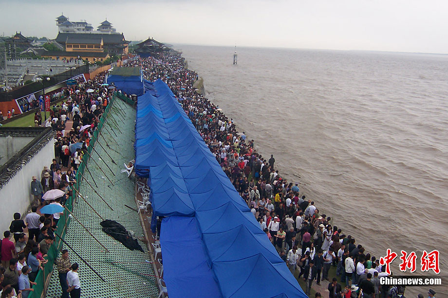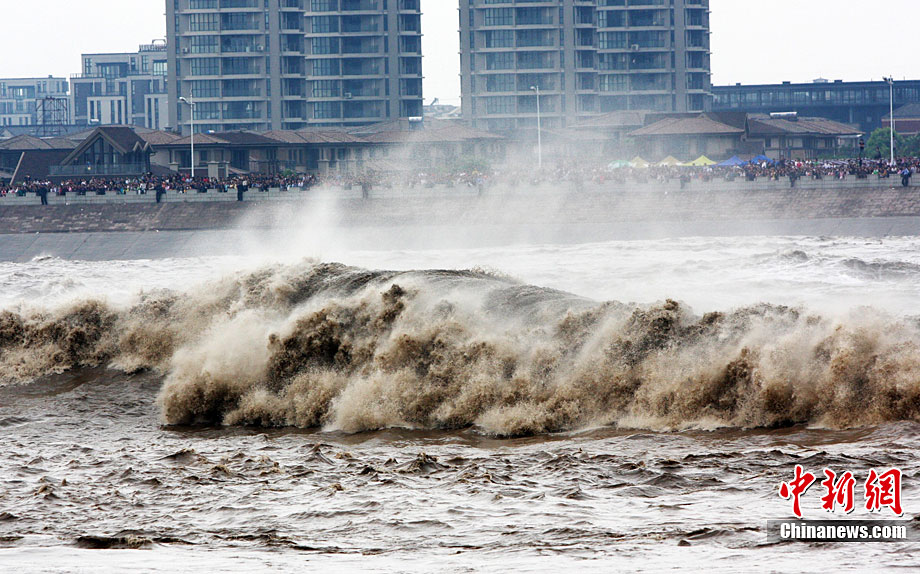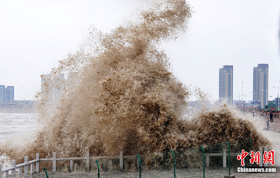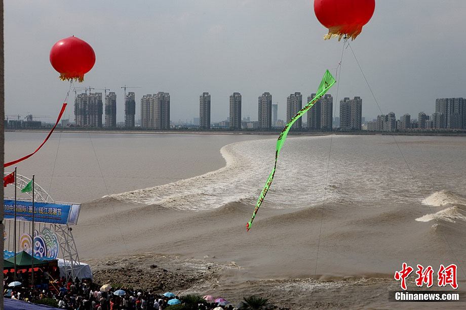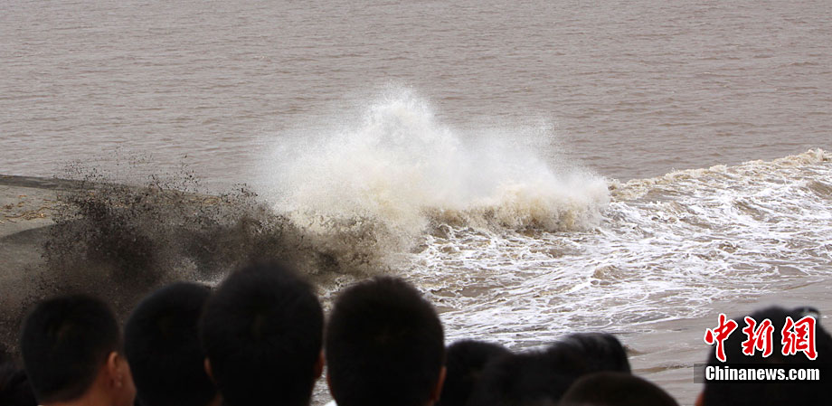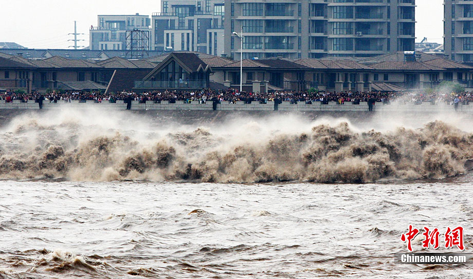 八月十八潮,壯觀天下無(wú)。9月25日12時(shí)38分,近八年最大錢塘潮如約而至抵達(dá)浙江省海寧鹽官,來(lái)自世界各地的游客爭(zhēng)睹“一線潮”景觀。汪恩民 攝