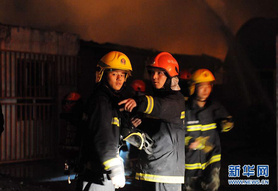 9月25日,消防官兵在火災(zāi)現(xiàn)場(chǎng)進(jìn)行撲救。當(dāng)日晚間,烏魯木齊國(guó)際機(jī)場(chǎng)跑道東側(cè)圍墻外一家“恒利擠塑板廠”發(fā)生火災(zāi)并有爆炸,由于有爆炸物散落到機(jī)場(chǎng)跑道,烏魯木齊國(guó)際機(jī)場(chǎng)關(guān)閉了一個(gè)小時(shí),清理跑道。圖片來(lái)源:新華網(wǎng) 王菲 攝