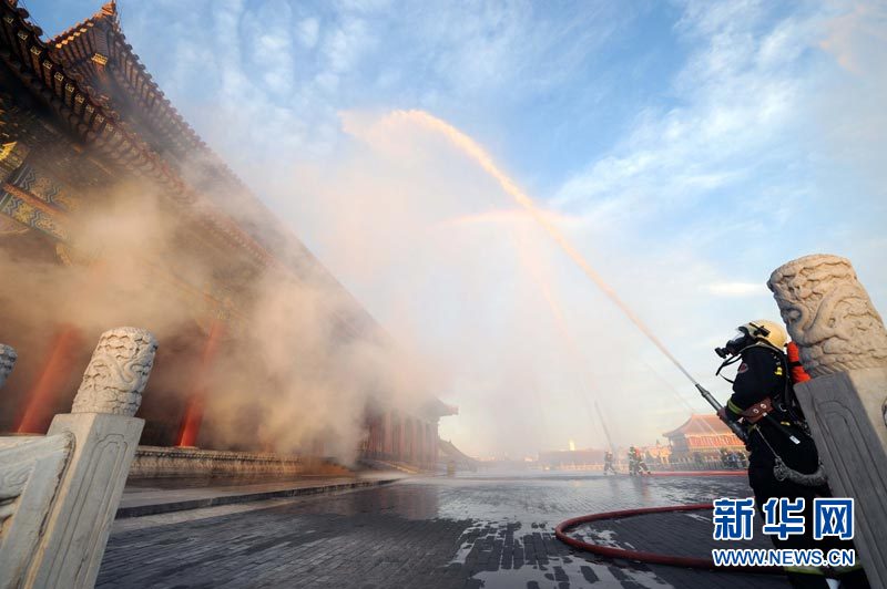 9月27日,北京消防部門在北京故宮太和殿舉行消防演習。北京消防部門開展多種形式的滅火救援演練,并加大演練的頻次和力度,保障今年“十一”長假期間的消防安全。李文 攝 圖片來源:新華網(wǎng)