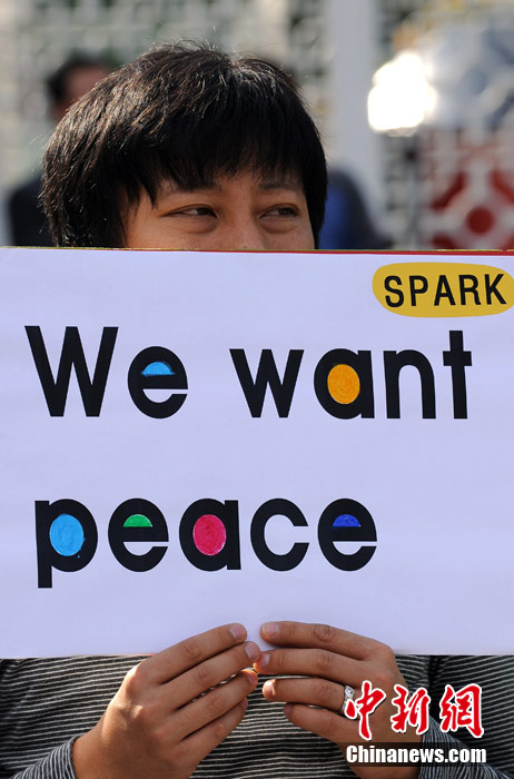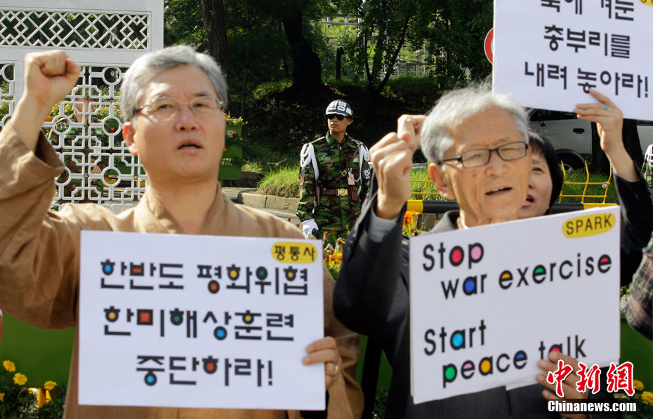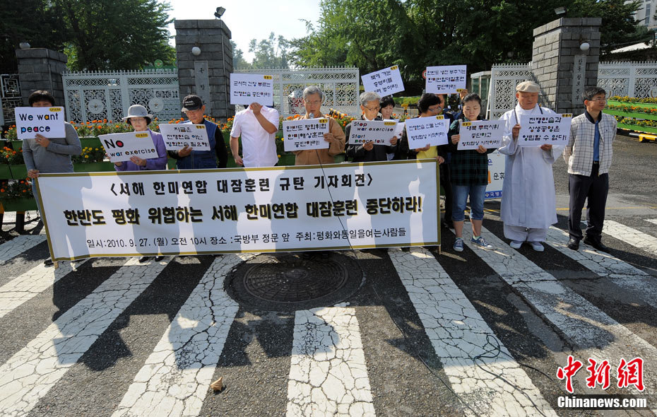 韓美反潛聯(lián)合軍事演習(xí)27日在韓國西部海域(黃海)拉開帷幕。當日,一些韓國反戰(zhàn)人士在國防部門前集會抗議美韓聯(lián)合軍演。