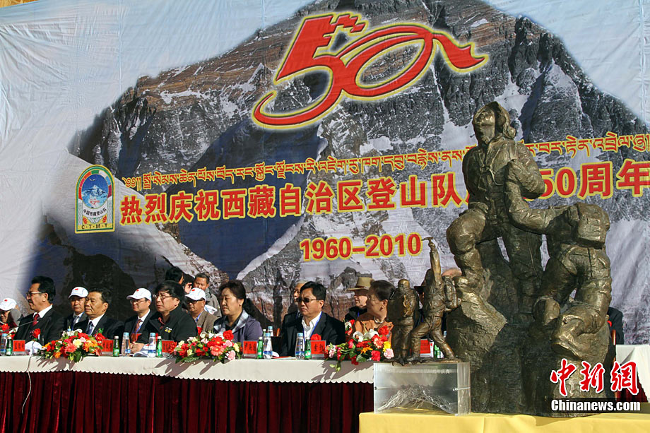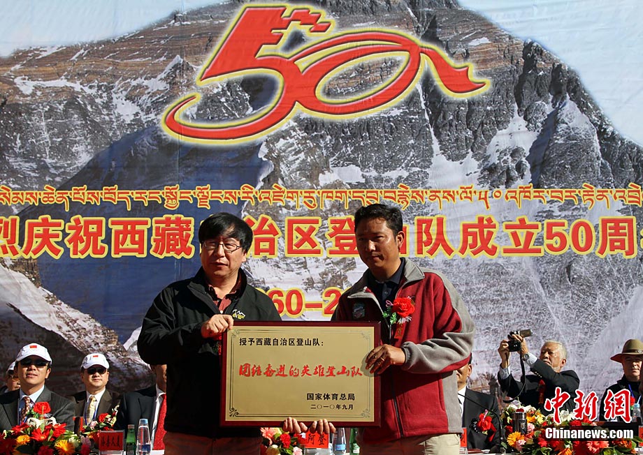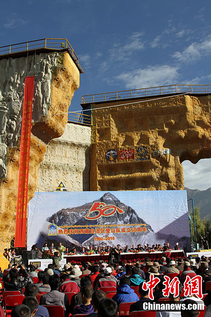 西藏自治區(qū)登山隊(duì)28日上午在拉薩舉行該隊(duì)成立50周年慶典。西藏自治區(qū)登山隊(duì)成立于1960年10月1日,是中國(guó)目前唯一齊裝滿員的專業(yè)登山運(yùn)動(dòng)隊(duì)。建隊(duì)50年來,先后有藏漢族登山運(yùn)動(dòng)員80多人登上世界第一高峰——珠穆朗瑪峰,280人次登上8000米以上高度。徐長(zhǎng)安 攝