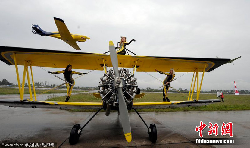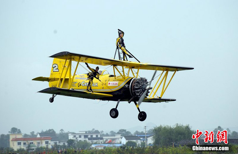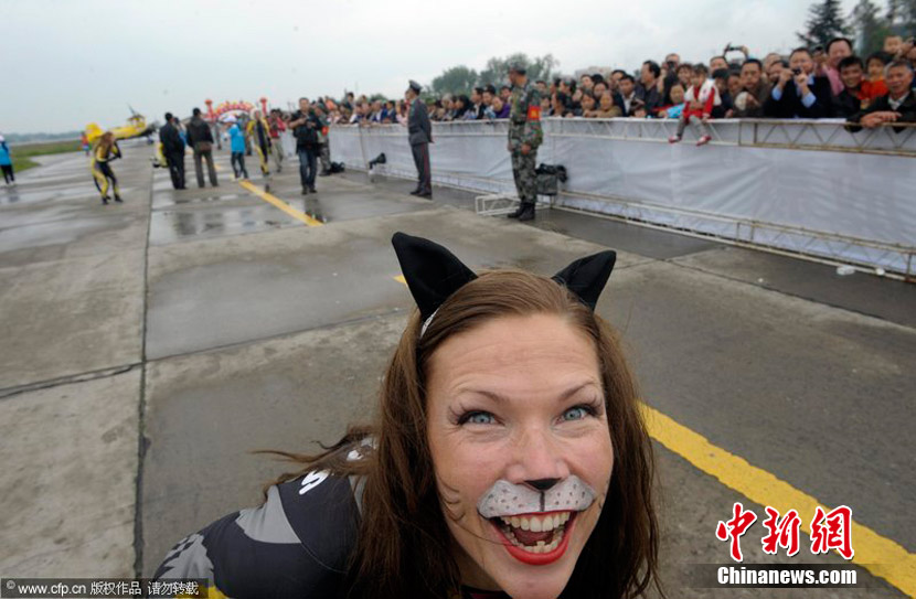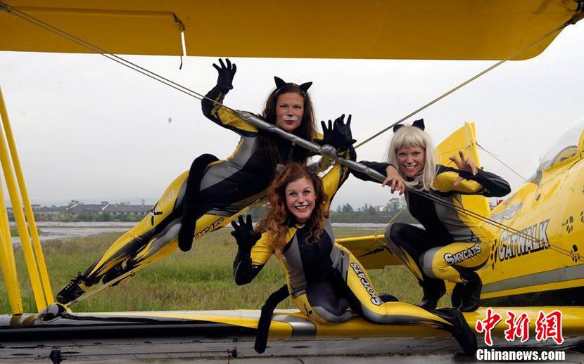 2010年9月30日,2010年首屆中國(重慶)國際飛行愛好者年會暨國際通用航空器展示交易會在重慶梁平縣開幕。雖本場航空表演僅對專業(yè)人士開放,仍然吸引了3萬人涌進梁平機場。圖為瑞典貓女郎準備進行“機翼行走”特技表演。圖片來源:CFP視覺中國