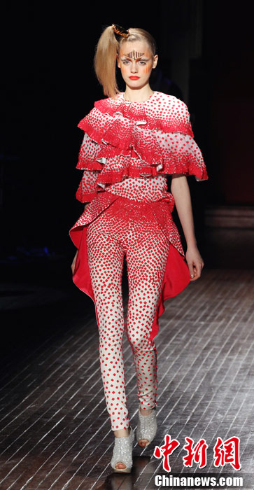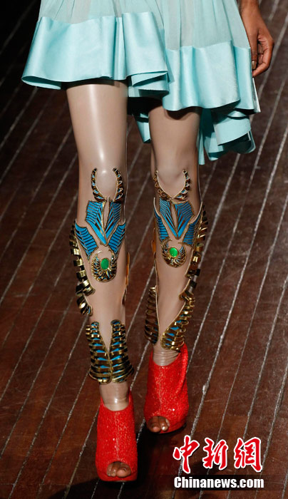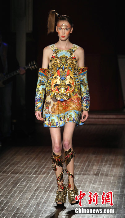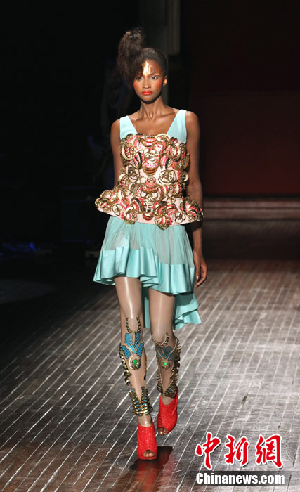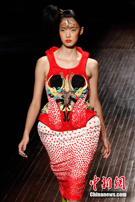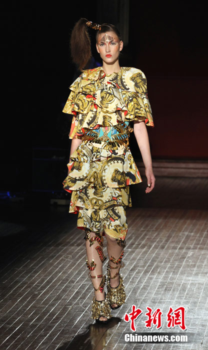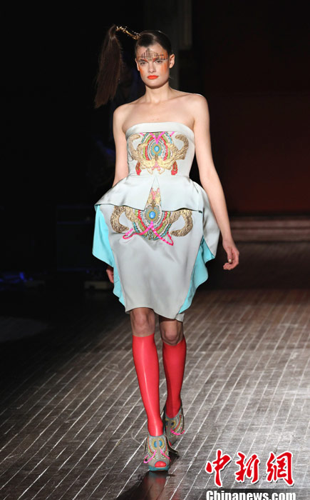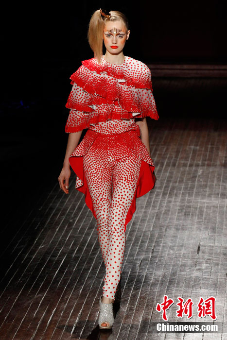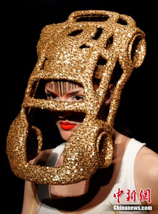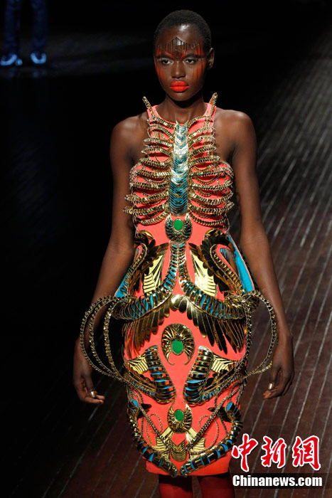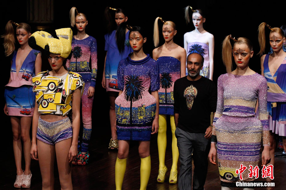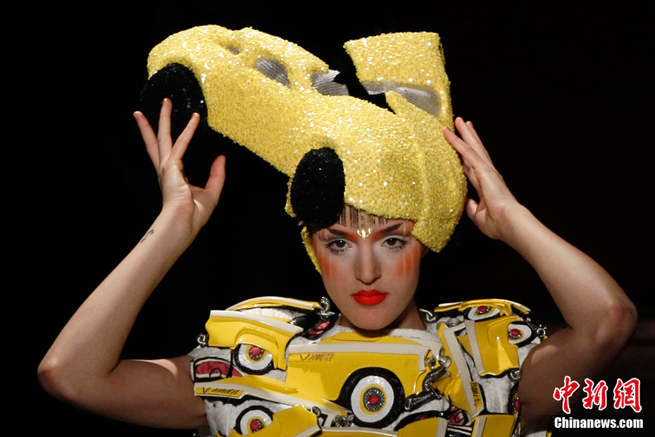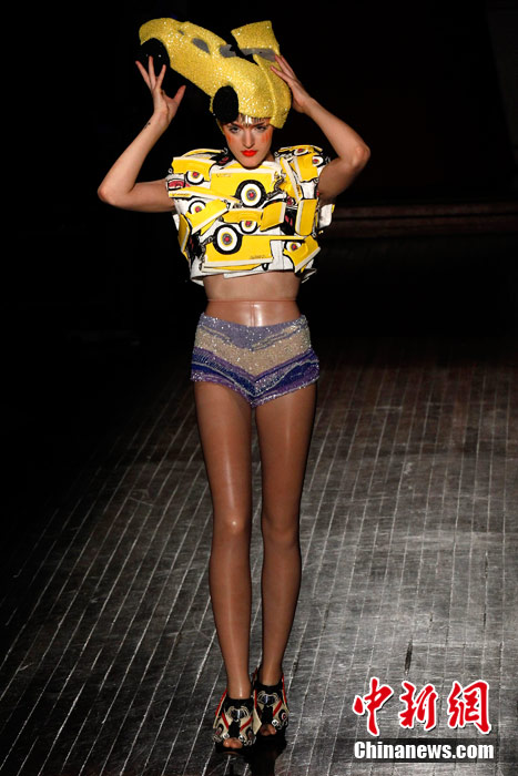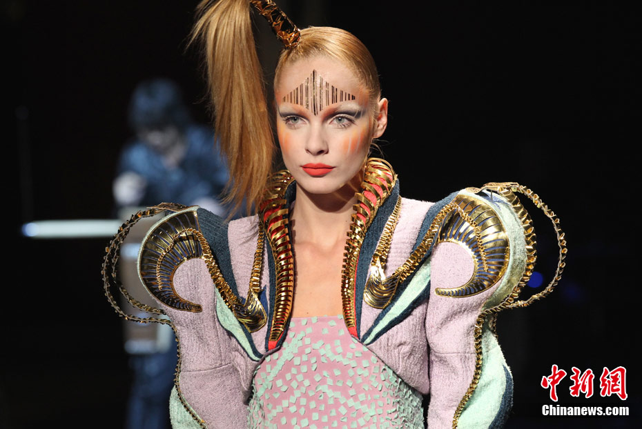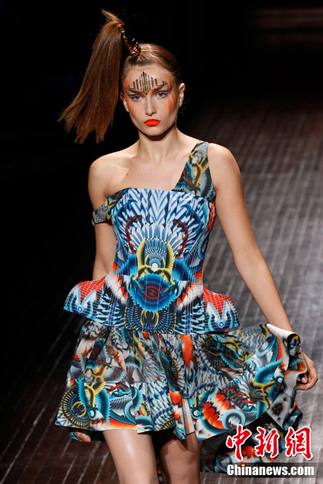 9月30日,巴黎時(shí)裝周上,模特在展示印度設(shè)計(jì)師曼尼詩·阿羅拉(Manish Arora)的作品。大膽鮮艷的另類風(fēng)格,讓人耳目一新。