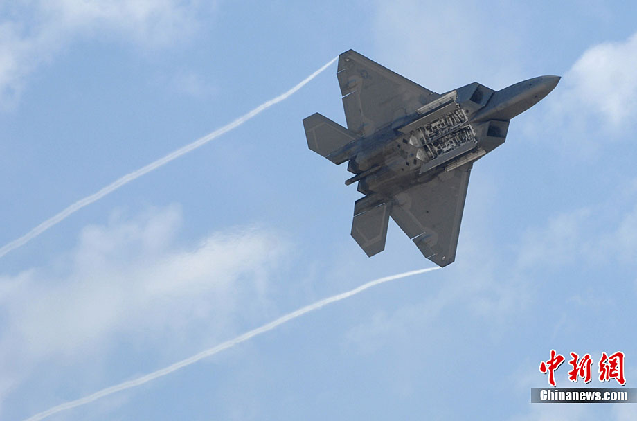 當(dāng)?shù)貢r(shí)間10月3日,美國著名的密拉瑪航空展在加州密拉瑪海軍陸戰(zhàn)隊(duì)航空基地舉行。三天的航空展示和飛行表演吸引了近70萬人次參觀。圖為美軍最先進(jìn)的F-22猛禽戰(zhàn)機(jī)空中英姿。中新社發(fā) 張煒 攝