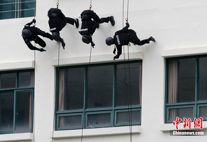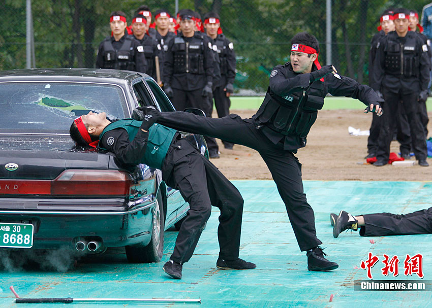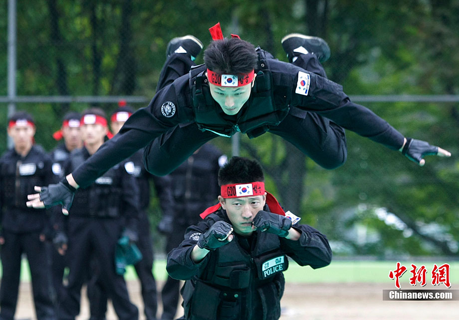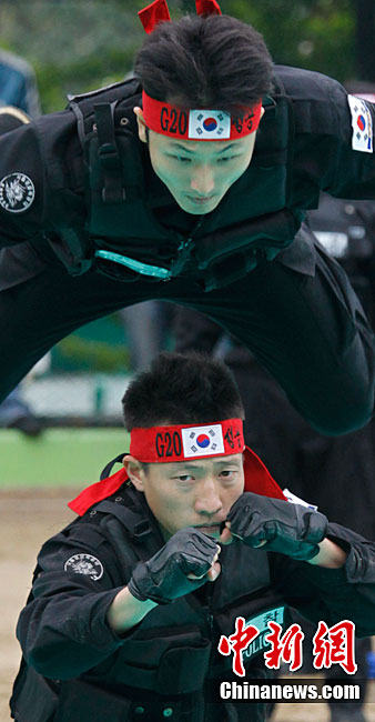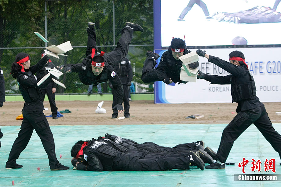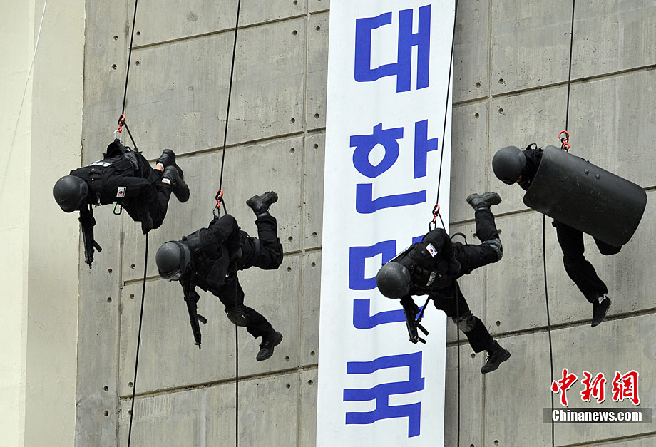 當(dāng)?shù)貢r(shí)間10月4日,韓國特警在首爾舉行了反恐演習(xí)。此次演習(xí)是為了即將于11月在韓國舉行的G20首腦峰會(huì)而做的準(zhǔn)備工作。