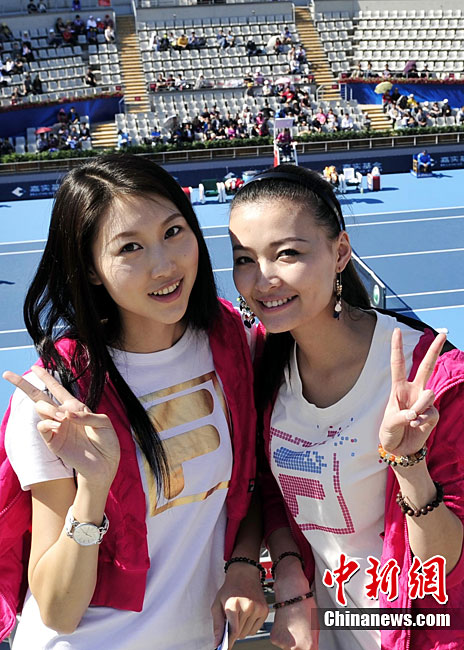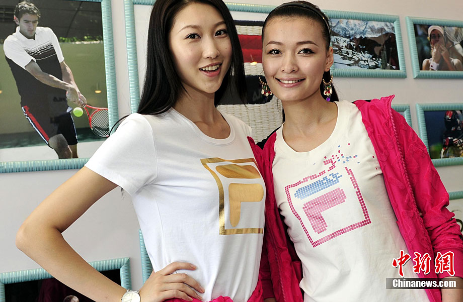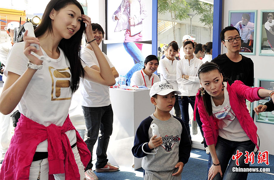 10月4日,時尚中網(wǎng)代言人、第五屆中國職業(yè)模特大賽冠軍趙晨池,首屆亞洲超級模特大賽冠軍王慧在北京亮相時尚運動品牌FILA展臺,與現(xiàn)場的球迷朋友們開展了一場別開生面的網(wǎng)球游戲體驗活動,助陣FILA及參與本屆中網(wǎng)的FILA四位代言人。中新社記者 錢興強 攝