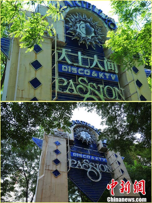 10月5日,北京東三環(huán)北路,蜚聲全國(guó)的京城第一夜總會(huì)——“天上人間”夜總會(huì)的招牌已經(jīng)摘下。此前,因涉嫌有償陪侍,“天上人間”夜總會(huì)被勒令停業(yè)整頓。圖為摘牌前后的“天上人間”夜總會(huì)。 圖片來(lái)源:CFP視覺(jué)中國(guó)
