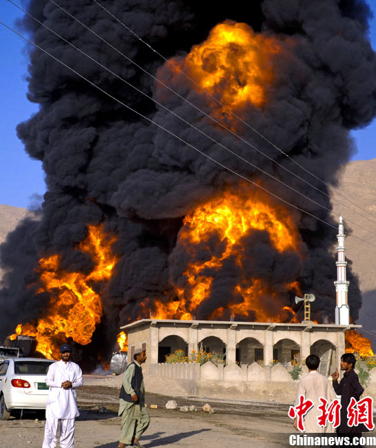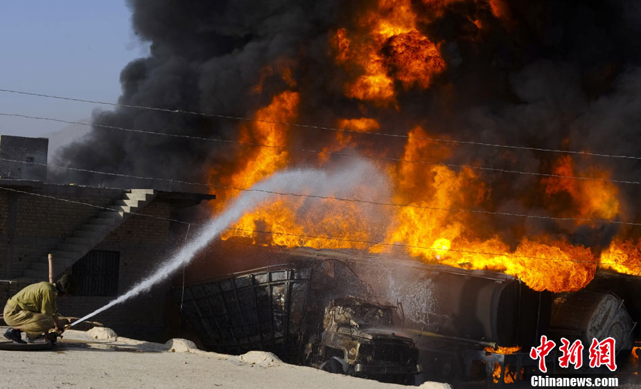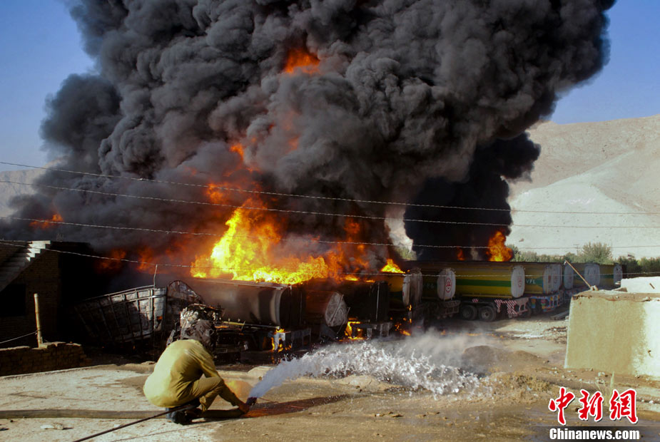 10月6日早晨,20多輛北約油罐車(chē)在巴基斯坦西部城市奎達(dá)附近被一伙身份不明的武裝分子燒毀,警方稱可能有人員傷亡。據(jù)報(bào)道稱,火勢(shì)非常猛烈,從距離很遠(yuǎn)的地方都能看到。消防隊(duì)員正在實(shí)施緊急滅火作業(yè)。