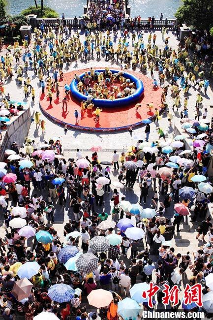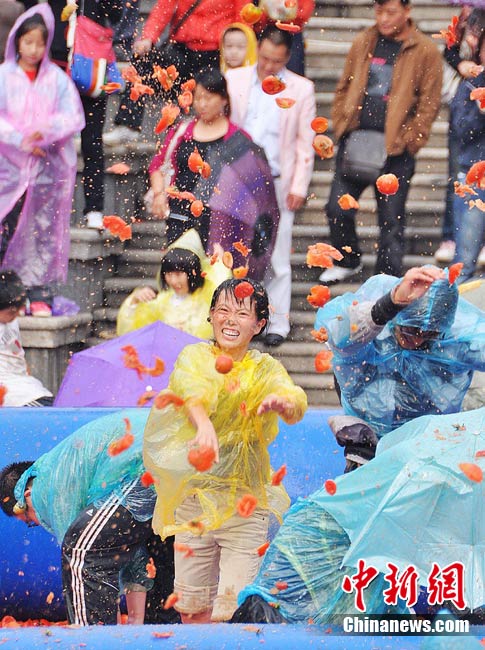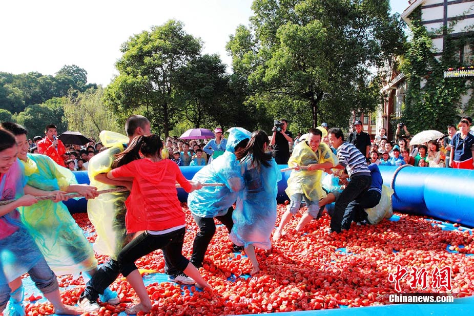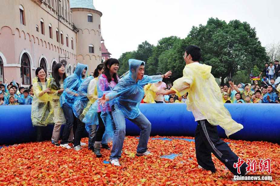 10月6日,艷陽高照的長沙世界之窗公園里,一群身著雨衣的年輕人在鋪滿西紅柿的池子里玩老鷹抓小雞的游戲,場面滑稽而激烈。國慶節(jié)期間,每天都有數(shù)千游客來這里參與“西紅柿大戰(zhàn)”,他們或用西紅柿互相“攻擊”,或玩拔河、老鷹抓小雞等游戲,盡情歡樂。中新社記者 肖前輝 攝