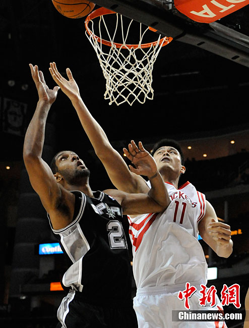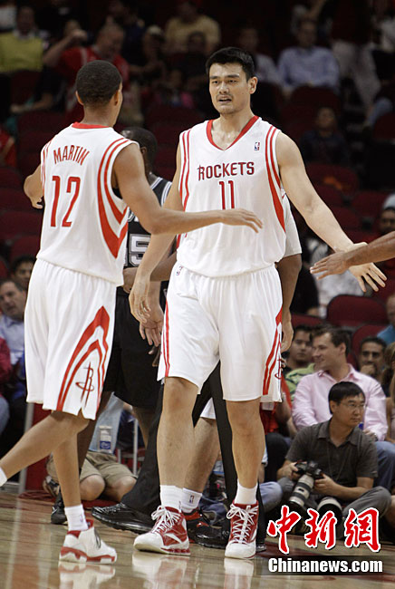 10月7日,美國休斯敦,10/11NBA季前賽,休斯敦火箭90-87圣安東尼奧馬刺。姚明上場12分48秒,8投2中得5分7個籃板,并有3次出色的蓋帽。