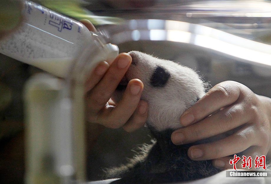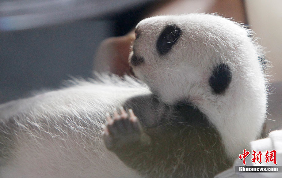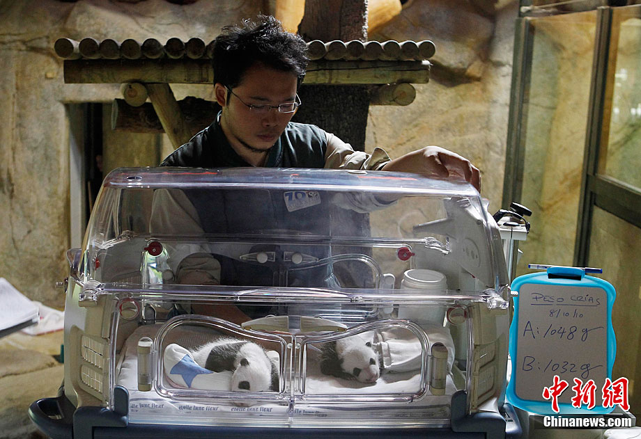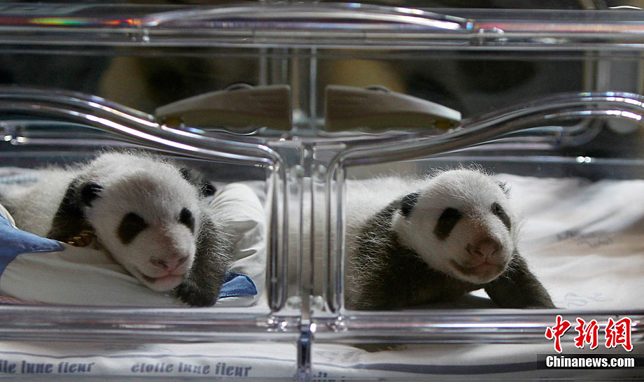 當(dāng)?shù)貢r間10月8日,西班牙馬德里動物園出生的兩只人工受精的大熊貓幼崽第一次向媒體亮相。這對雙胞胎均為雄性,9月7日出生時他們的體重只有5盎司(141.5克)。經(jīng)過不斷的護(hù)理,它們現(xiàn)在體重已超過1公斤,并可以向媒體亮相了。