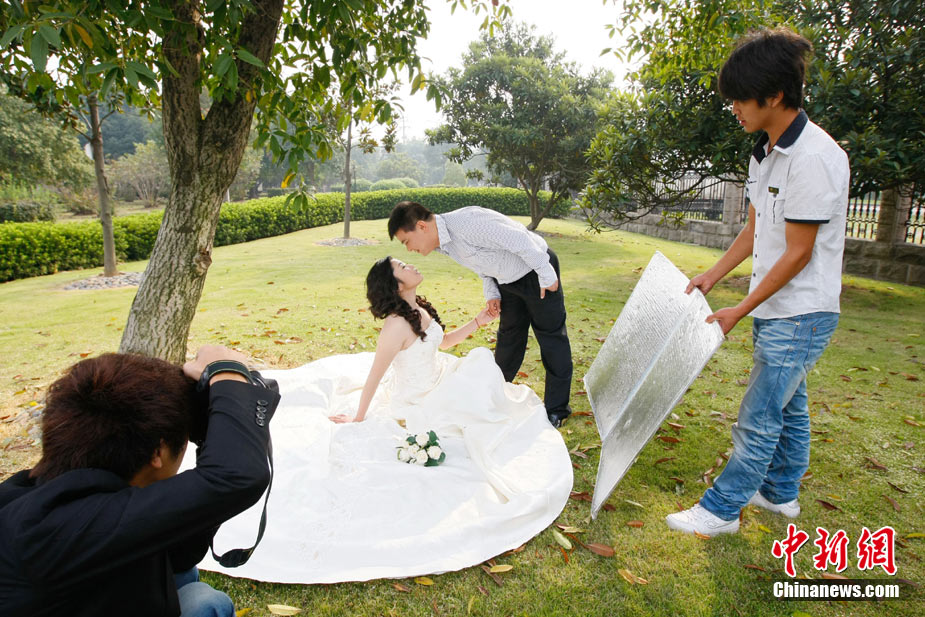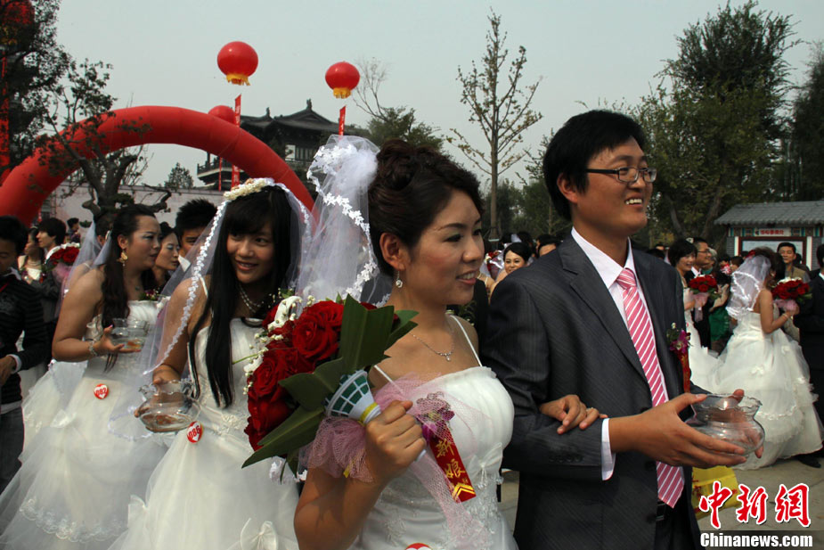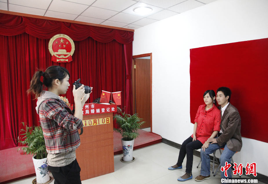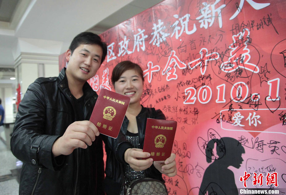 2010年10月10日,全國各地新人辦理結(jié)婚登記。很多新人選擇被寓意“十全十美”的好日子領(lǐng)結(jié)婚證。圖為鄭州出現(xiàn)結(jié)婚登記高峰,導(dǎo)致各區(qū)民政局婚姻登記處門前都排起長長的隊(duì)伍。一對新人在長長的隊(duì)伍中手挽手排除等候。沙浪 攝 圖片來源:CFP視覺中國