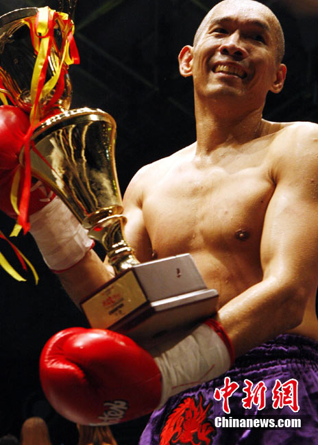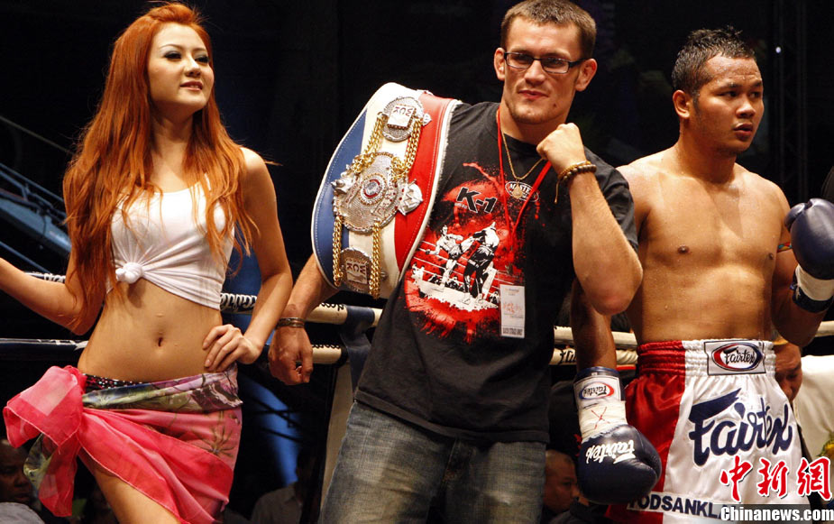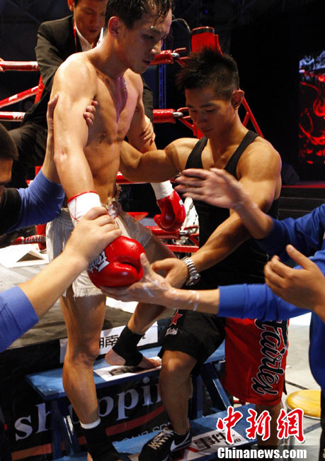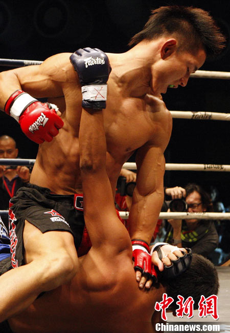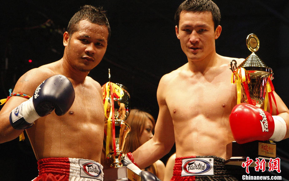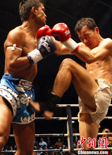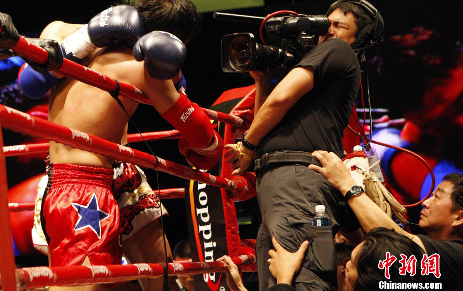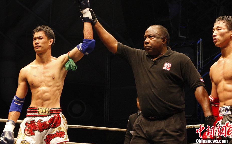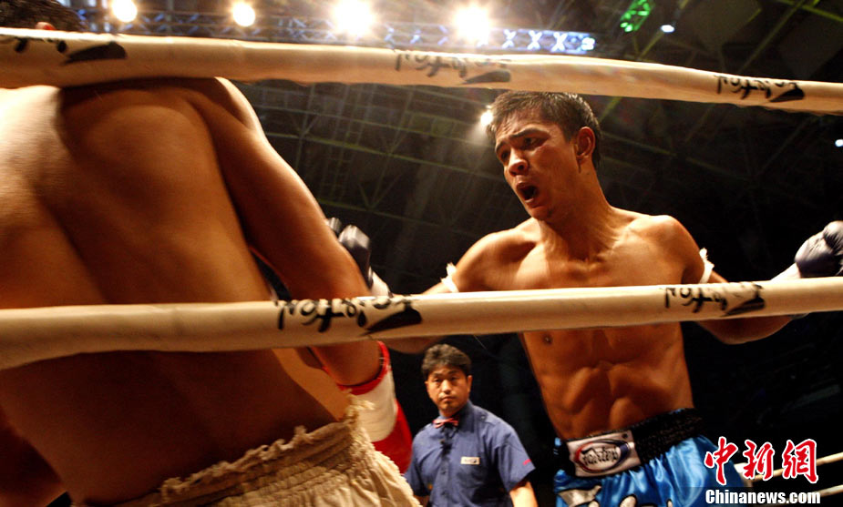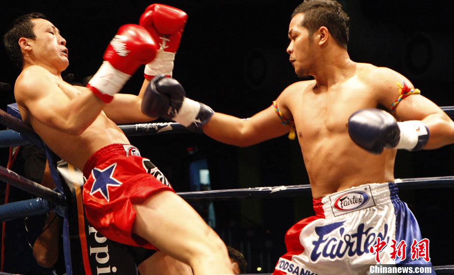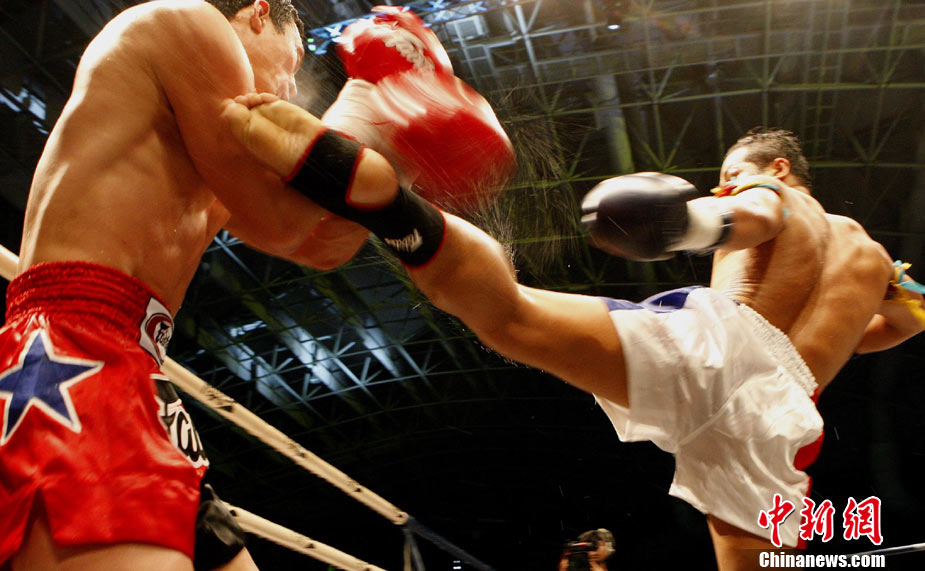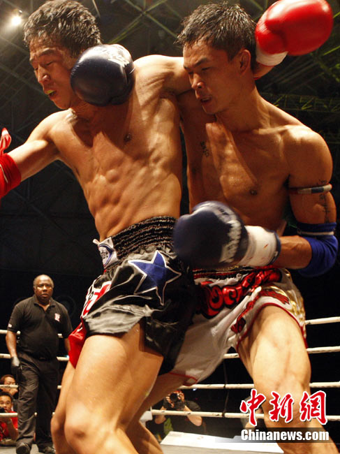 10月9日晚,由馬來(lái)西亞IPC國(guó)際集團(tuán)和中國(guó)國(guó)際文化傳播中心以及英雄傳說(shuō)賽事機(jī)構(gòu)聯(lián)手主辦的“英雄傳說(shuō)-決戰(zhàn)云頂”世界搏擊王者爭(zhēng)霸賽暨中泰拳王爭(zhēng)霸戰(zhàn)在馬來(lái)西亞吉隆坡云頂舉行。圖為泰國(guó)拳王雅桑克萊與中國(guó)王冠對(duì)決。 中新社記者 錢(qián)興強(qiáng) 攝