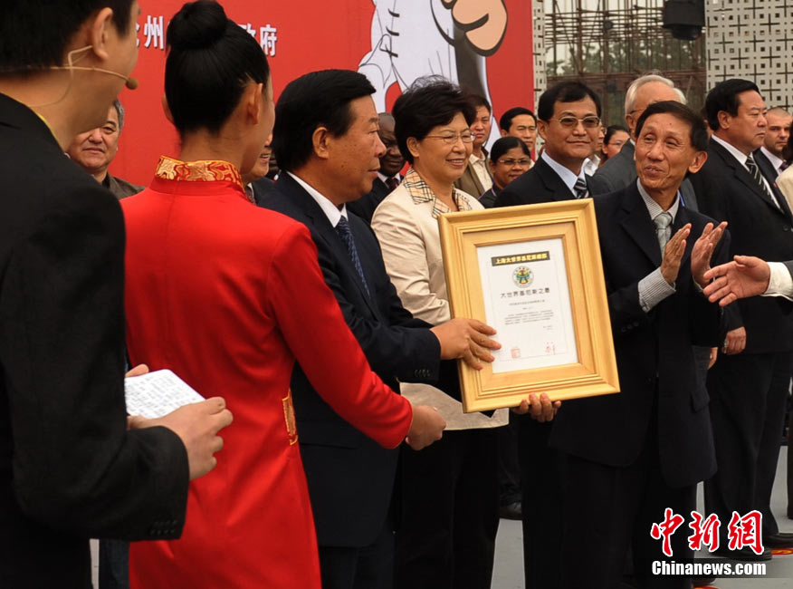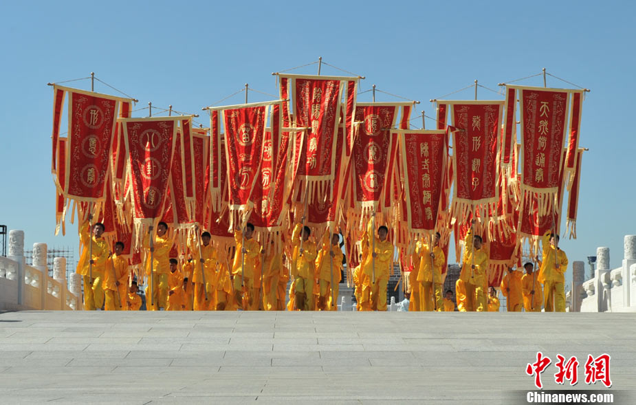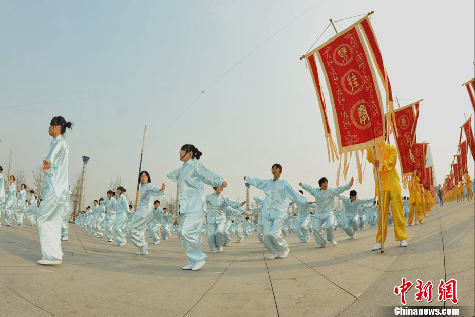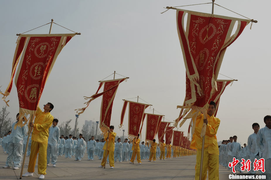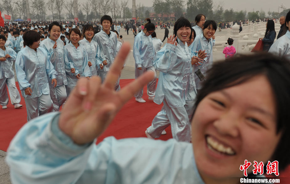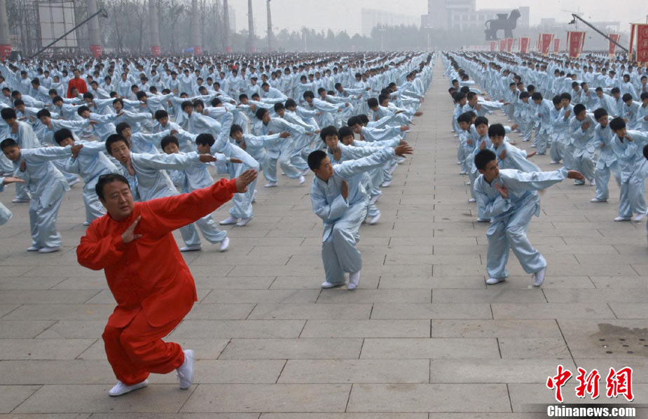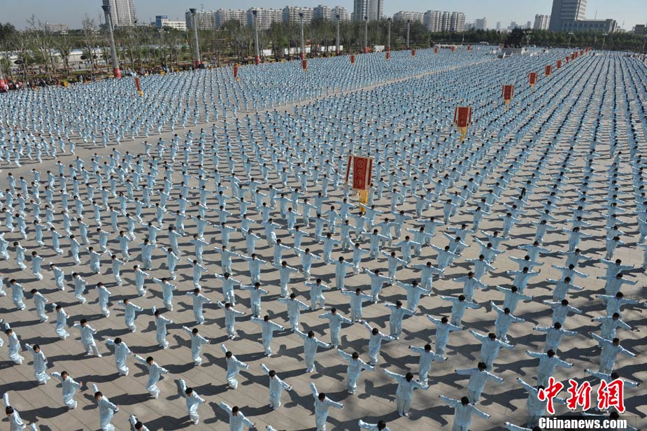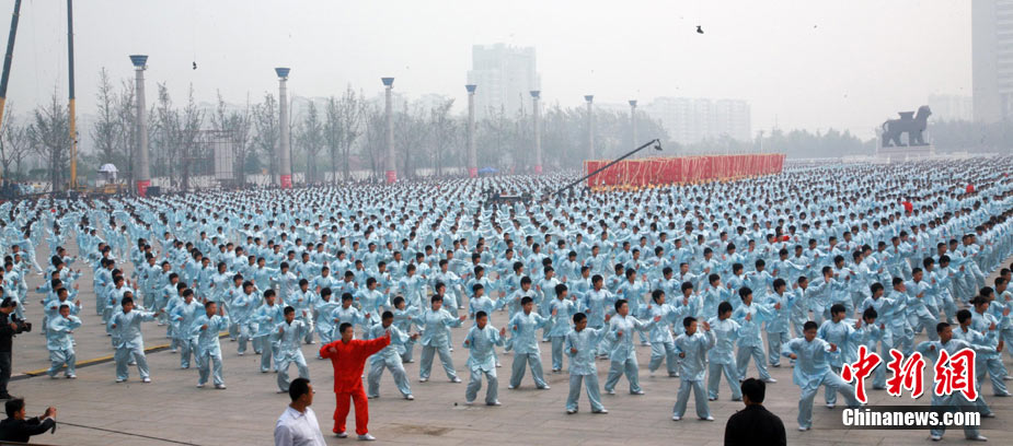 10月10日,中國“武術之鄉(xiāng)”滄州獅城公園廣場“拳濤”滾滾、武健泱泱,1.5萬人同習53個拳種,創(chuàng)造了《中國武術拳種同時展演數量之最》吉尼斯紀錄,上海大世界吉尼斯總部現場認證。圖為萬人習武現場。王少華 張書儉 攝