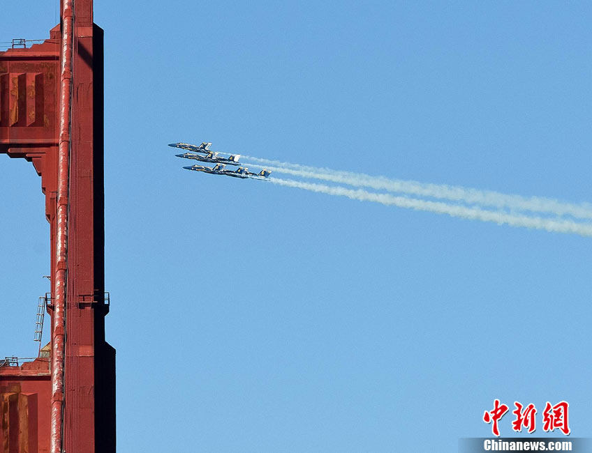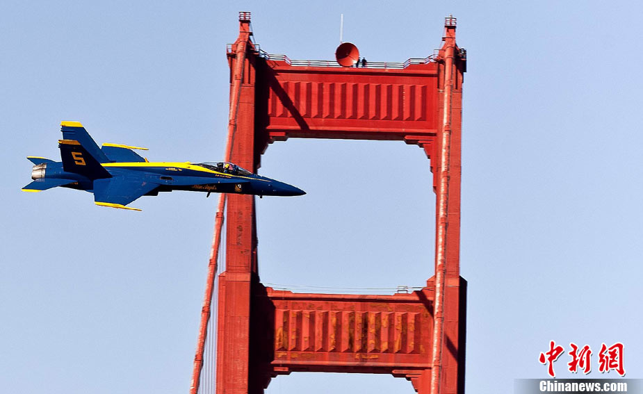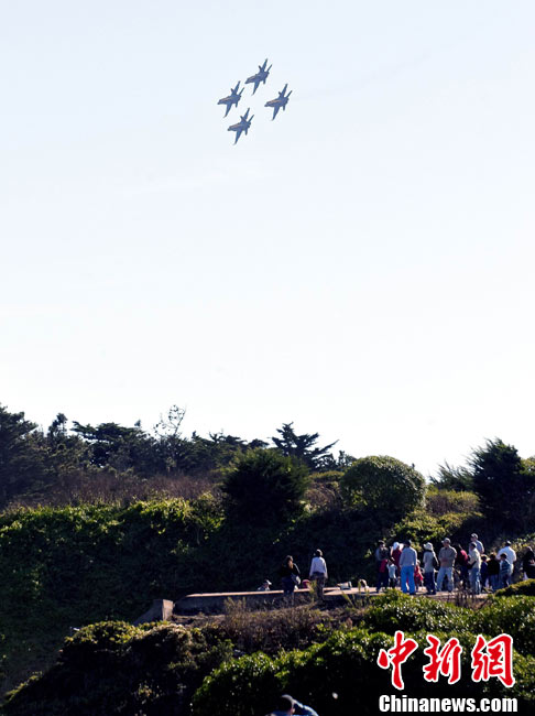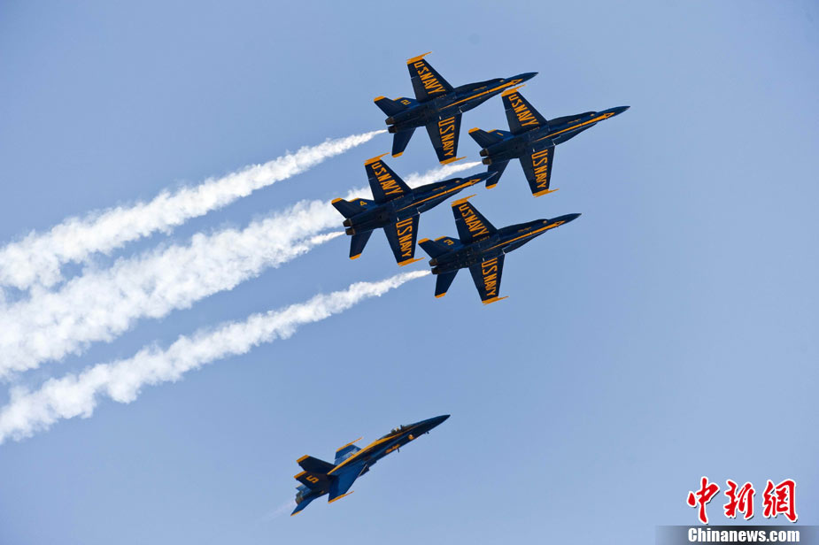 當(dāng)?shù)貢r間10月9日下午,美國海軍藍(lán)天使飛行表演隊在舊金山舉行一年一度的“艦隊周”活動。圖為5架F-18戰(zhàn)斗機(jī)編隊表演。 中新社發(fā) 陳鋼 攝