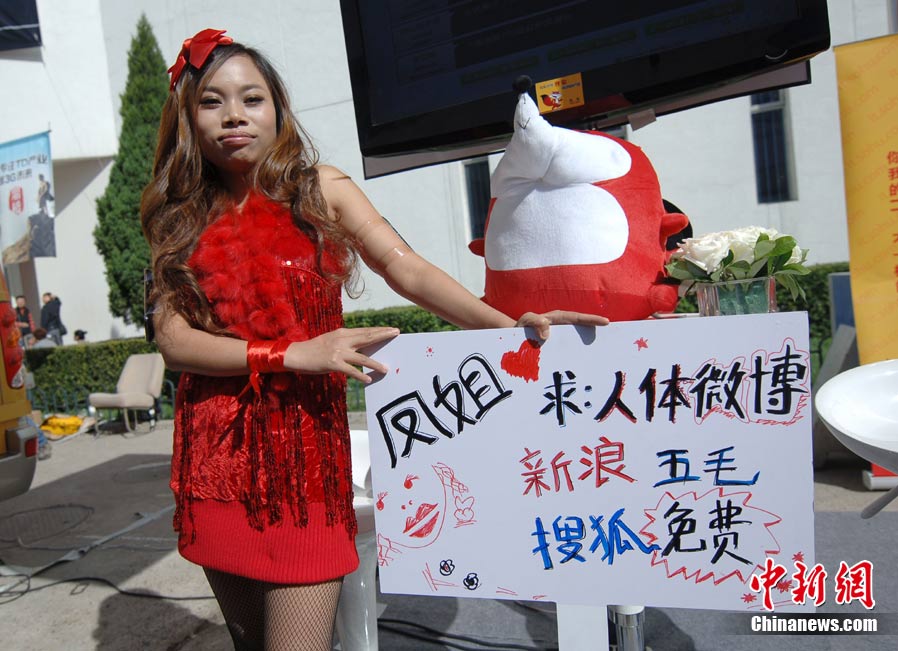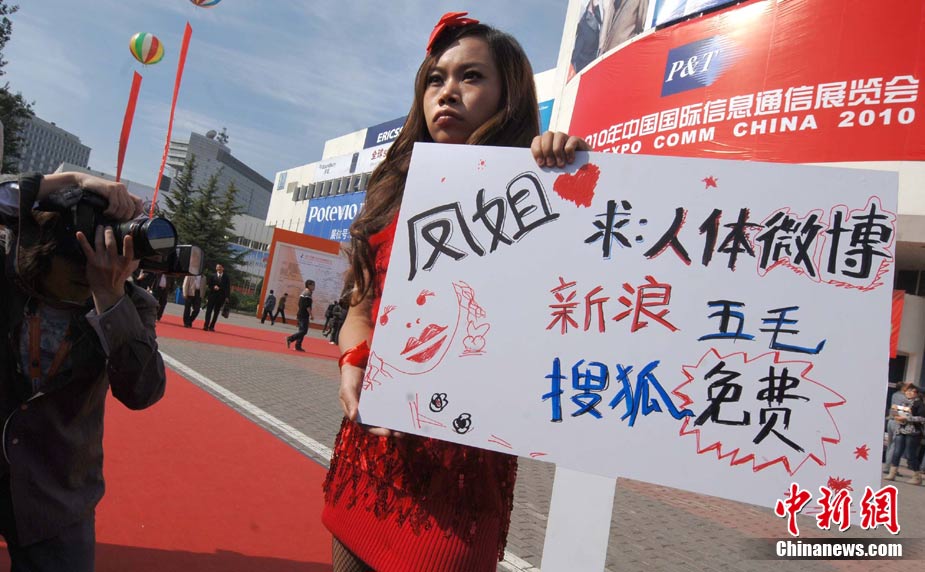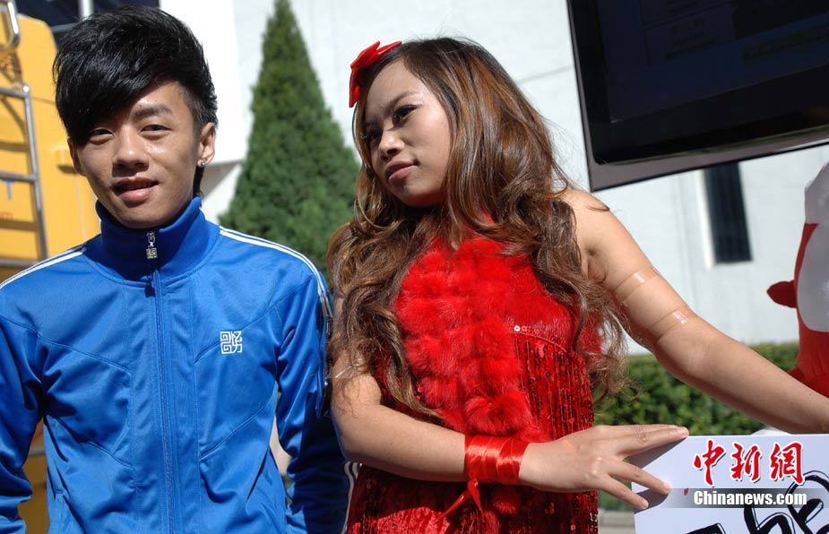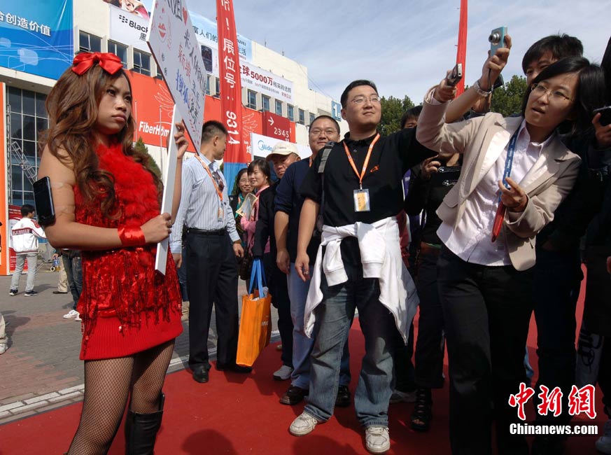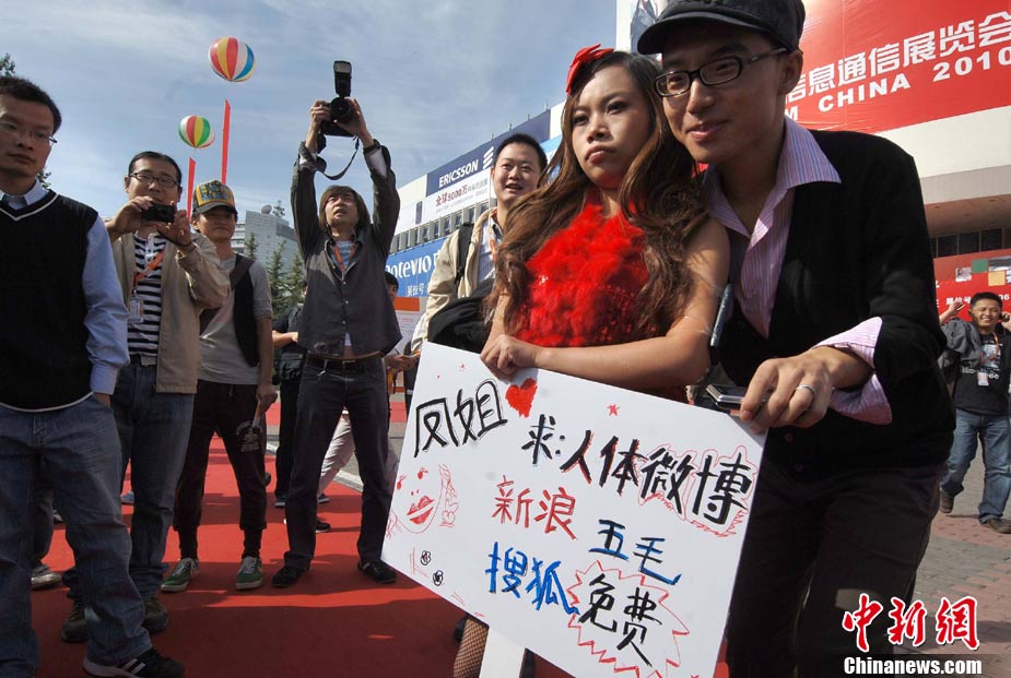 10月12日,中國網(wǎng)絡(luò)紅人--鳳姐在北京中國國際展覽中心亮相,她在參加2010中國國際信息通信展覽會宣傳時,受到數(shù)百網(wǎng)絡(luò)粉絲的熱捧,并拍照留影。圖為一名男子與鳳姐合影。中新社記者 鄒憲 攝