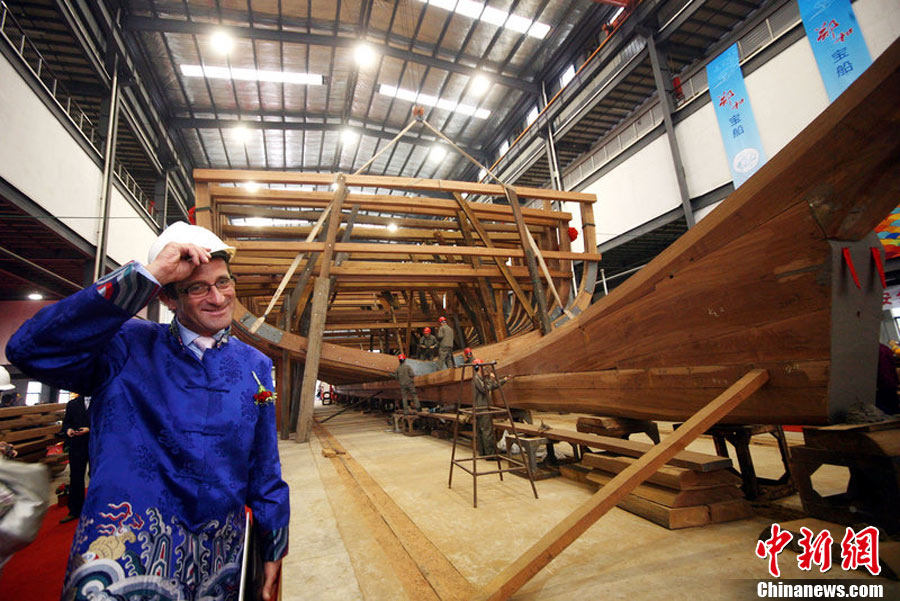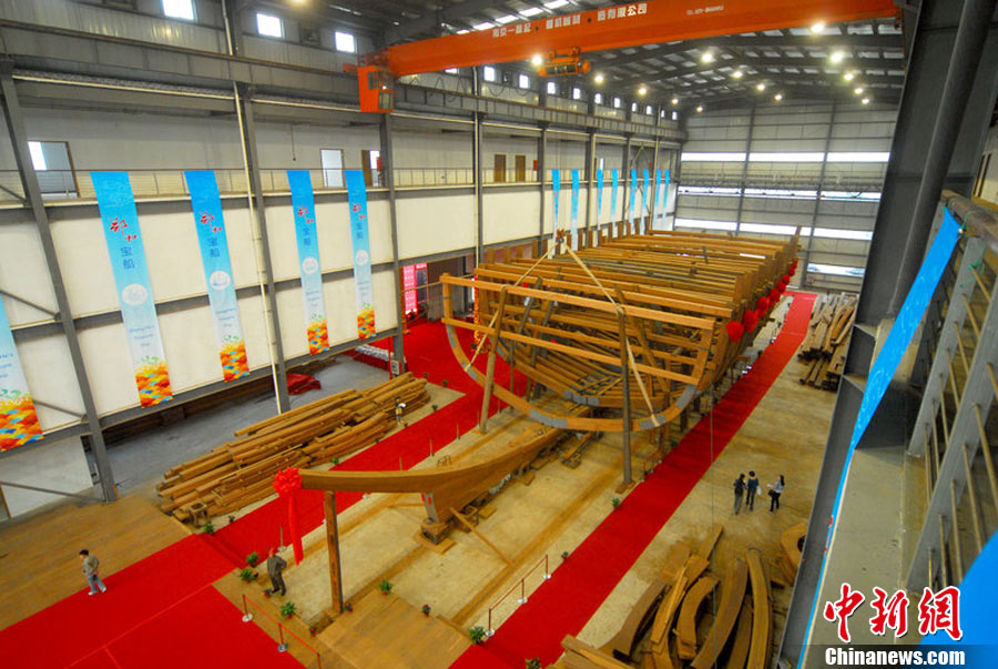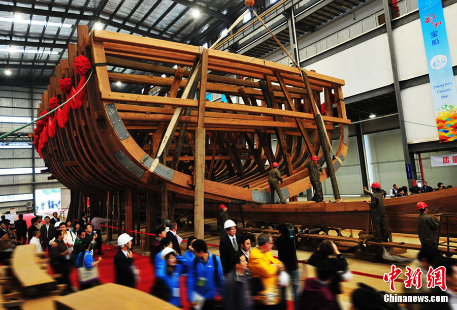 10月20日,南京,作為“2010年南京名城會”的序曲,“鄭和寶船復(fù)建慶典”在鄭和寶船廠舉行,主體已經(jīng)完工1/3的“鄭和寶船”露出“廬山真面目”。這座鄭和寶船將在明年9月船體竣工,2013年將沿著鄭和當年的航海路線“環(huán)球航行”。圖為復(fù)建的寶船進行了肋骨安放儀式。邵丹 攝 圖片來源:CFP視覺中國