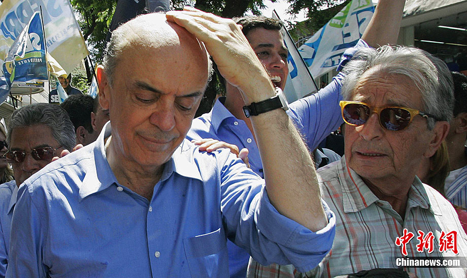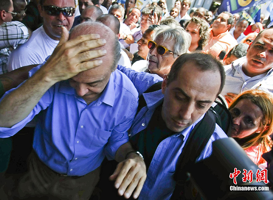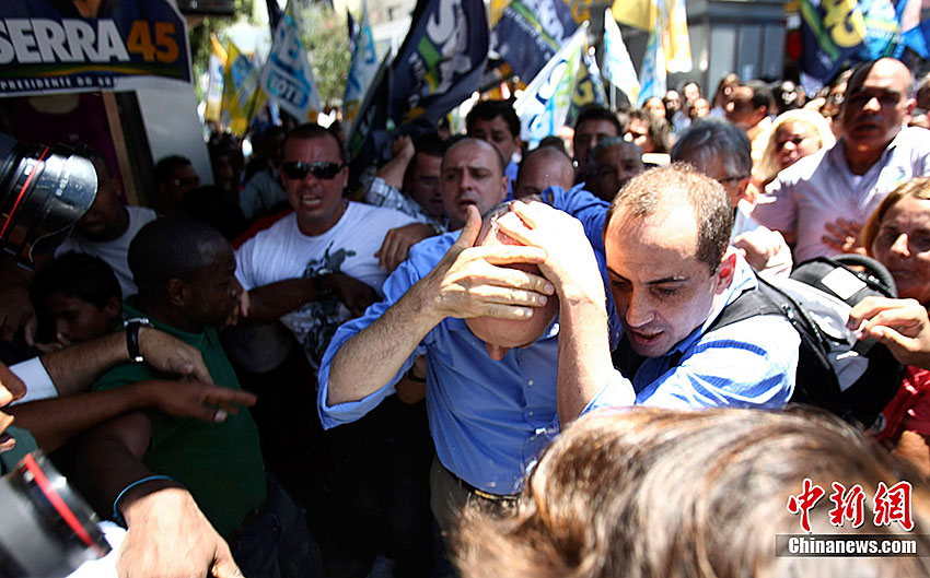 當(dāng)?shù)貢r(shí)間10月20日,在巴西里約熱內(nèi)盧以西,社會(huì)民主黨總統(tǒng)候選人若澤·塞拉在參加一場(chǎng)競(jìng)選宣傳活動(dòng)時(shí)被不明投擲物擊中頭部,隨后在安保人員和支持者的護(hù)送下離開了現(xiàn)場(chǎng)。