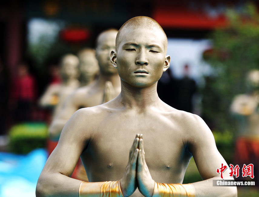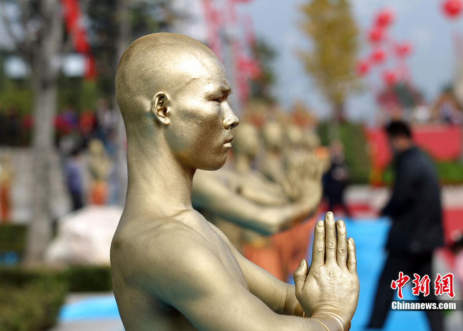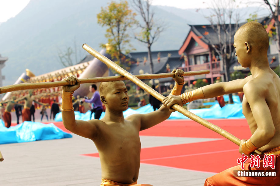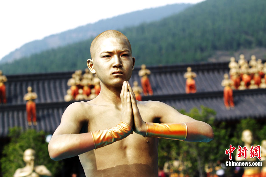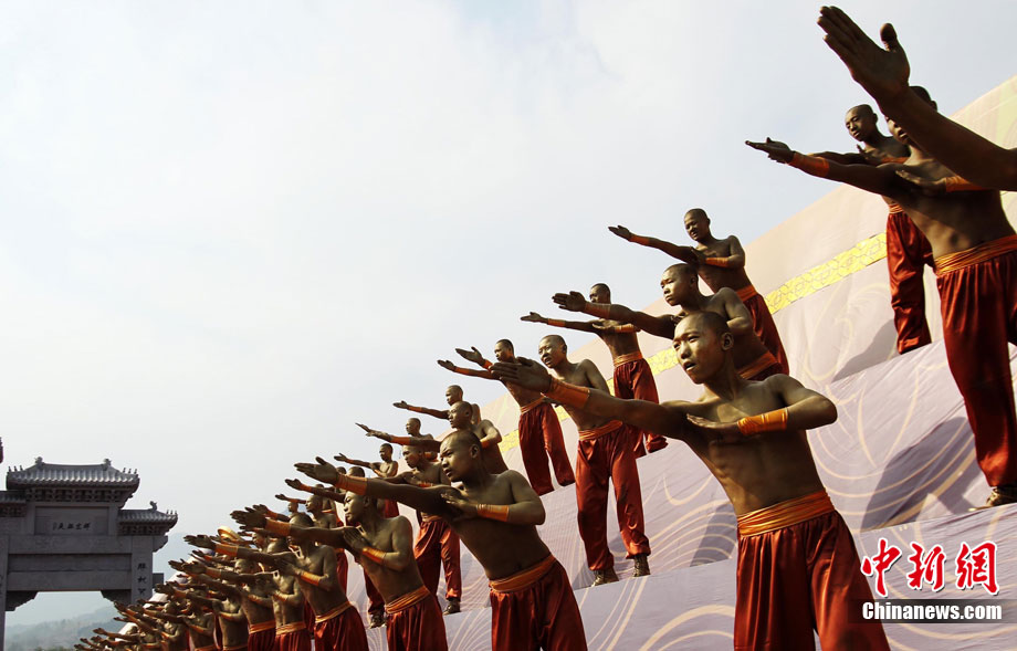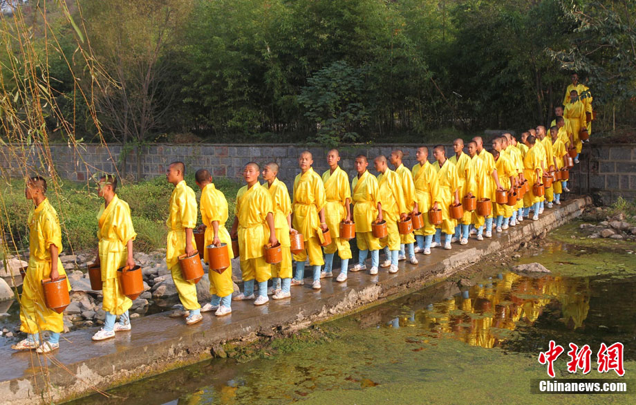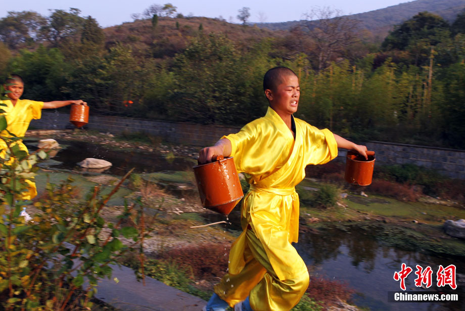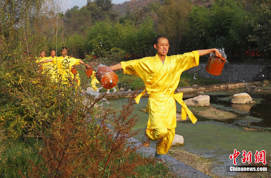 10月23日,千年古剎河南嵩山少林寺,少林和尚們雙臂平伸,提著水桶快步如飛,再現(xiàn)了少林和尚水上漂的武林絕技。中新社記者 王中舉 攝