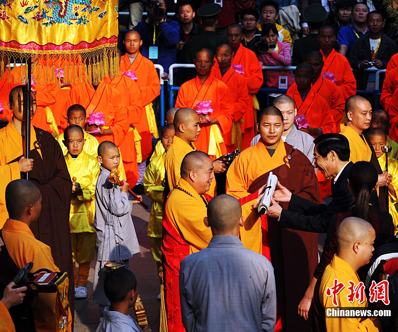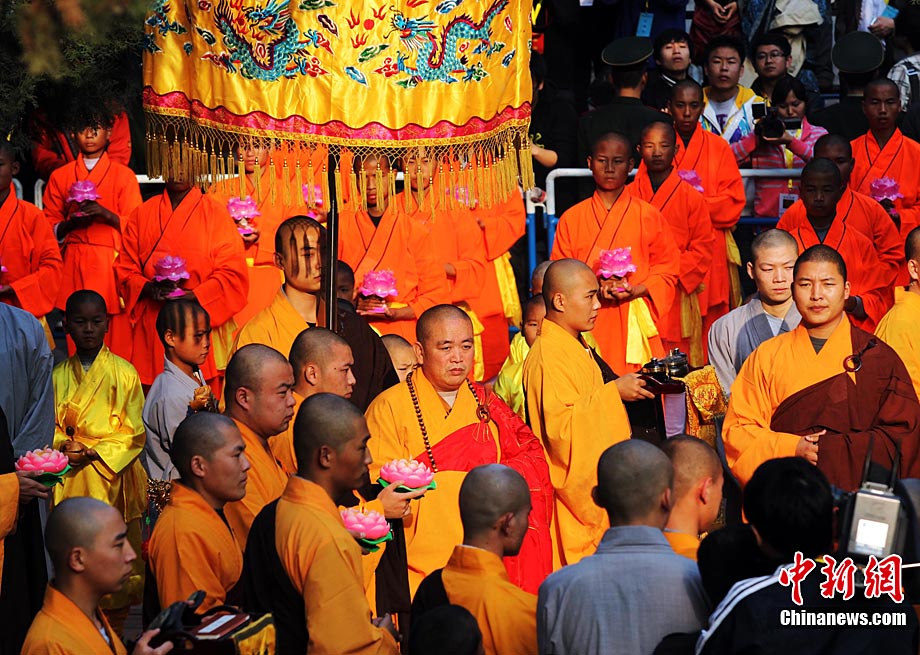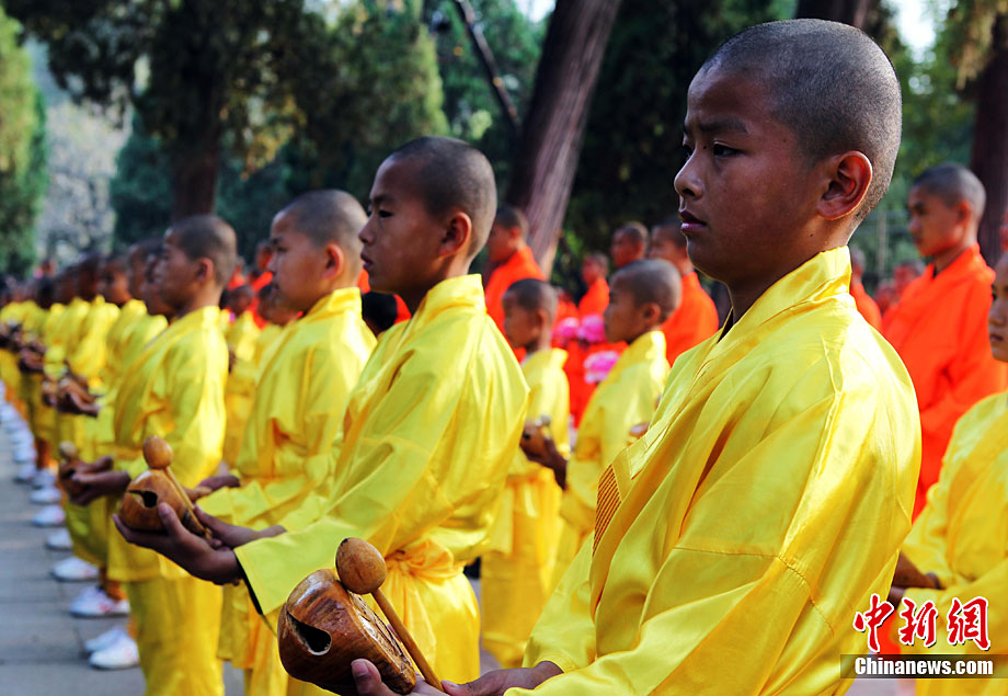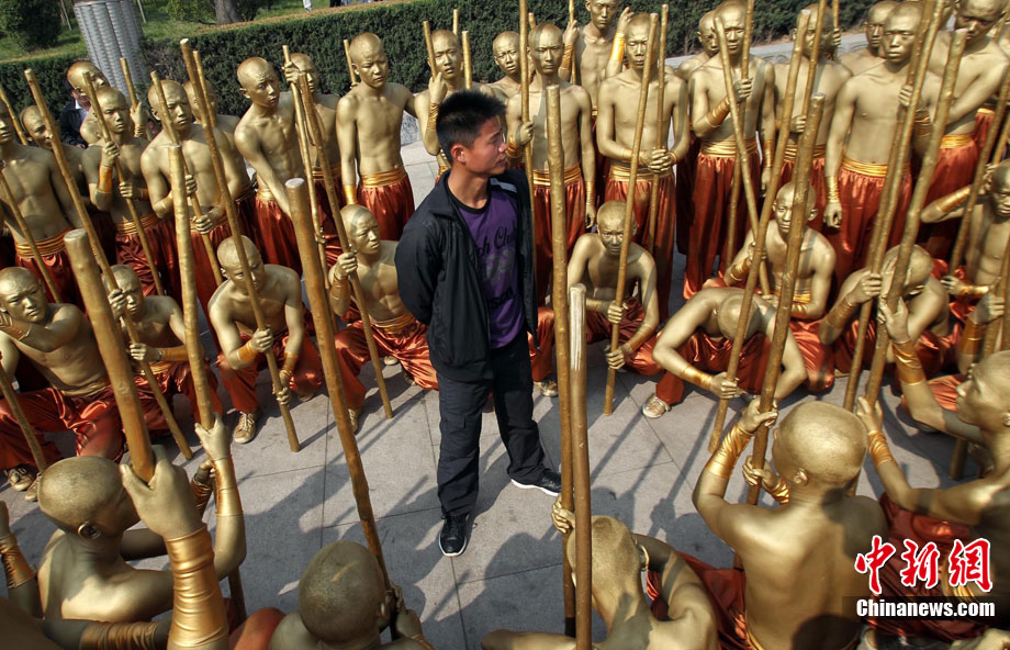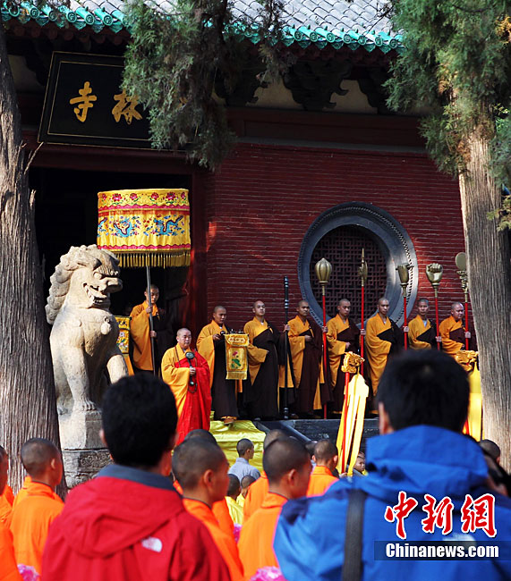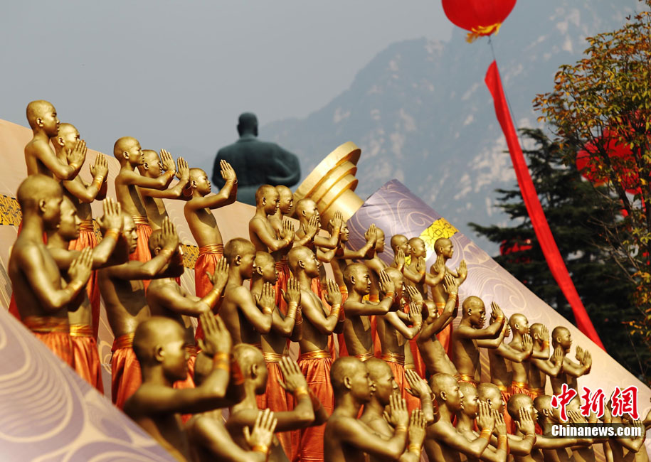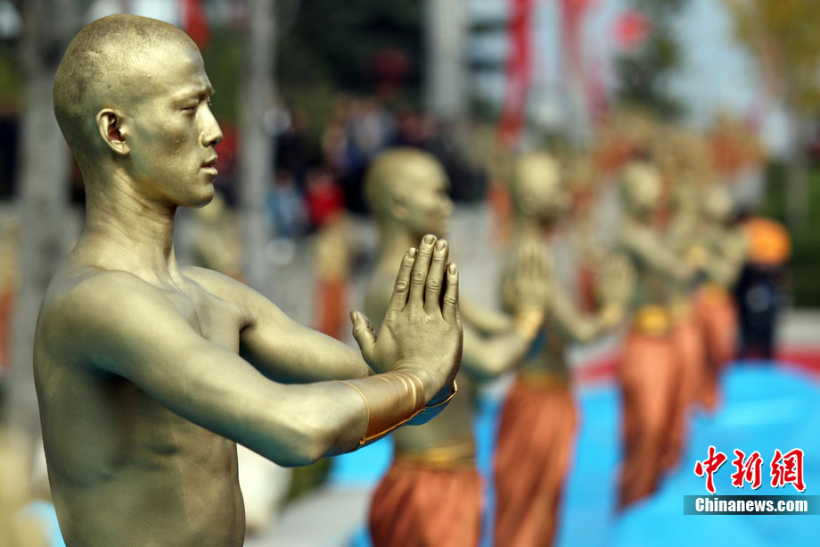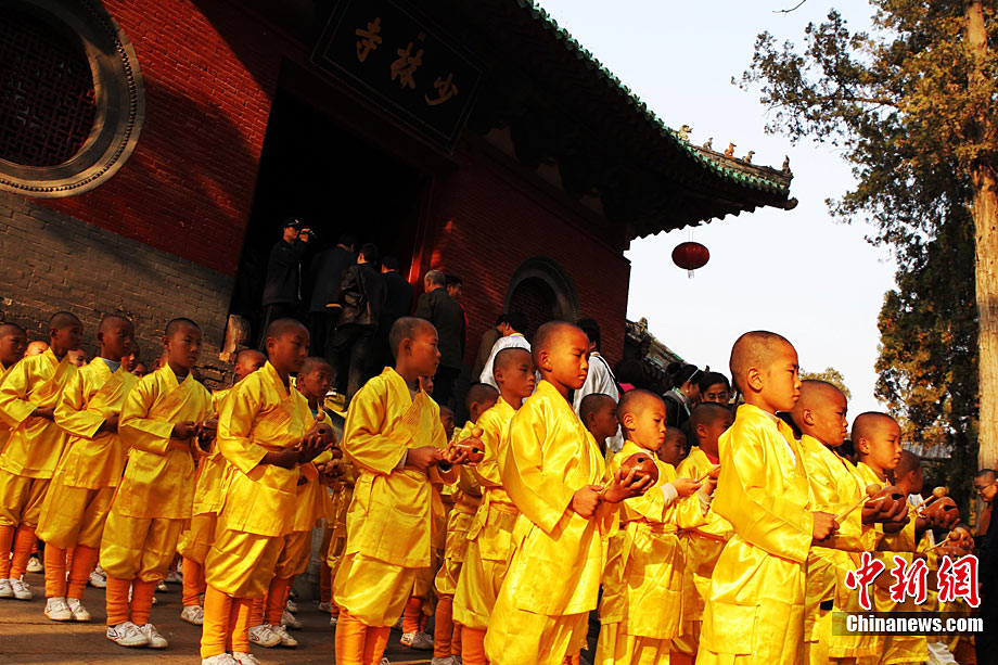 10月23日,千年古剎河南嵩山少林寺,少林和尚們雙臂平伸,提著水桶快步如飛,再現(xiàn)了少林和尚水上漂的武林絕技。中新社記者 王中舉 攝