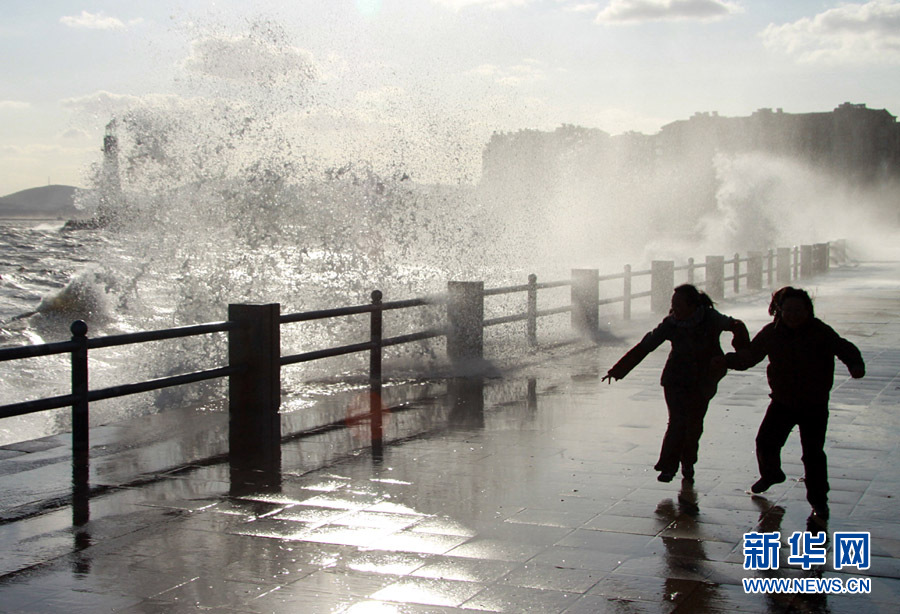 10月25日,一名行人從山東威海海濱掀起的浪花旁走過。當(dāng)日,受強冷空氣影響,山東威海海上風(fēng)力達(dá)8至9級,陣風(fēng)風(fēng)力達(dá)到11級,海濱大浪排空,威海市海上搜救中心發(fā)布海上風(fēng)險黃色預(yù)警。于啟波 攝 圖片來源:新華網(wǎng)