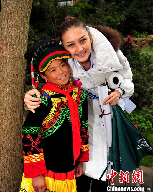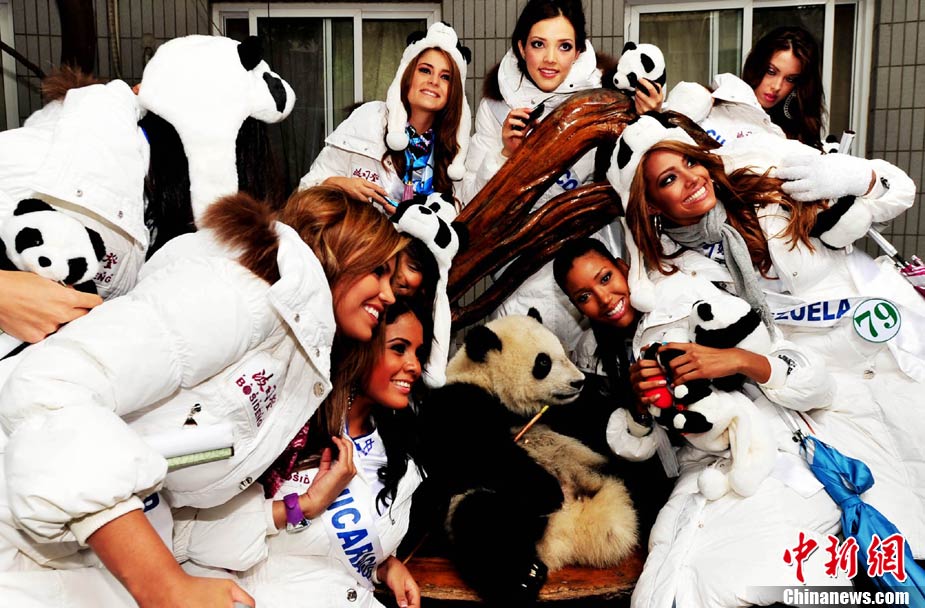 10月26日,參加第50屆國(guó)際小姐世界大會(huì)全球總決賽的70多位佳麗,來(lái)到成都市大熊貓繁育研究基地,參加擁抱熊貓嬌子活動(dòng)。 中新社發(fā) 安源 攝