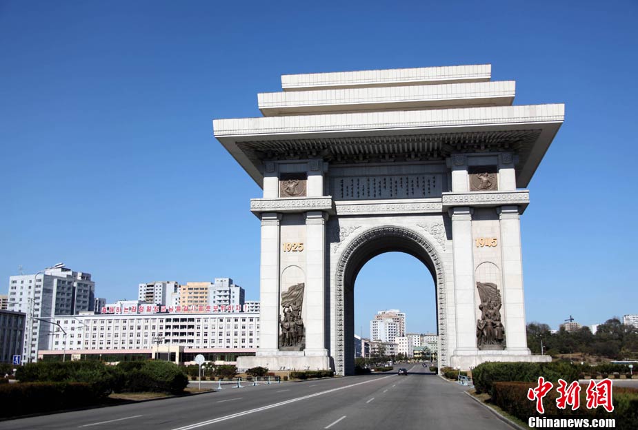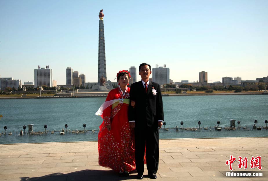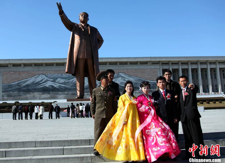 10月26日,朝鮮平壤街頭陽(yáng)光明媚、秋高氣爽,一對(duì)對(duì)新人來到市中心的萬壽臺(tái),向金日成銅像獻(xiàn)花,并在偉人銅像前合影留念。中新社記者 孫自法 攝