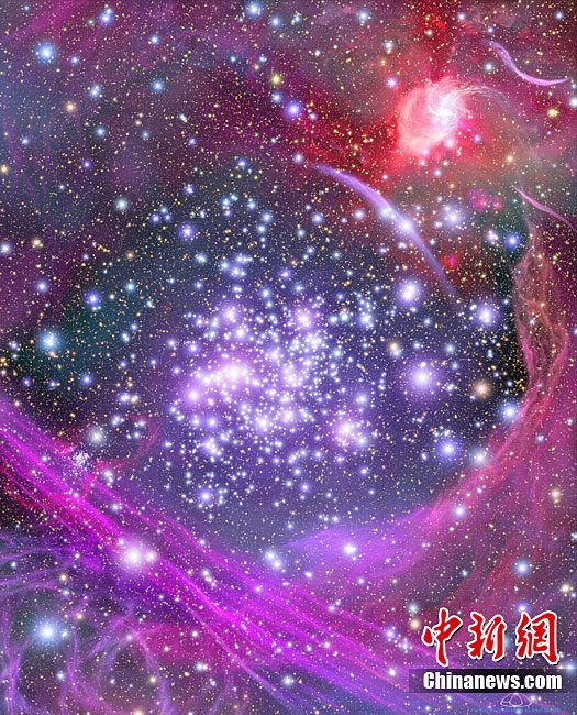 美國(guó)宇航局(NASA)近日公布了銀河系深處拱門(mén)星團(tuán)的最新藝術(shù)效果圖。改圖根據(jù)哈勃太空望遠(yuǎn)鏡和一些地面望遠(yuǎn)鏡拍攝的圖像描繪而成。拱門(mén)星團(tuán)存在于銀河系中心黑洞附近,包含有大約3萬(wàn)個(gè)類(lèi)似于太陽(yáng)的恒星,而且該恒星團(tuán)的密度在銀河系所有已知同類(lèi)天體構(gòu)造中是最大的。據(jù)測(cè)算,Arches的直徑約為三光年,其內(nèi)部天體密度超過(guò)太陽(yáng)系約一百萬(wàn)倍。