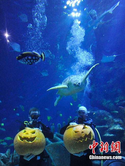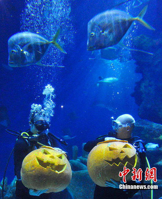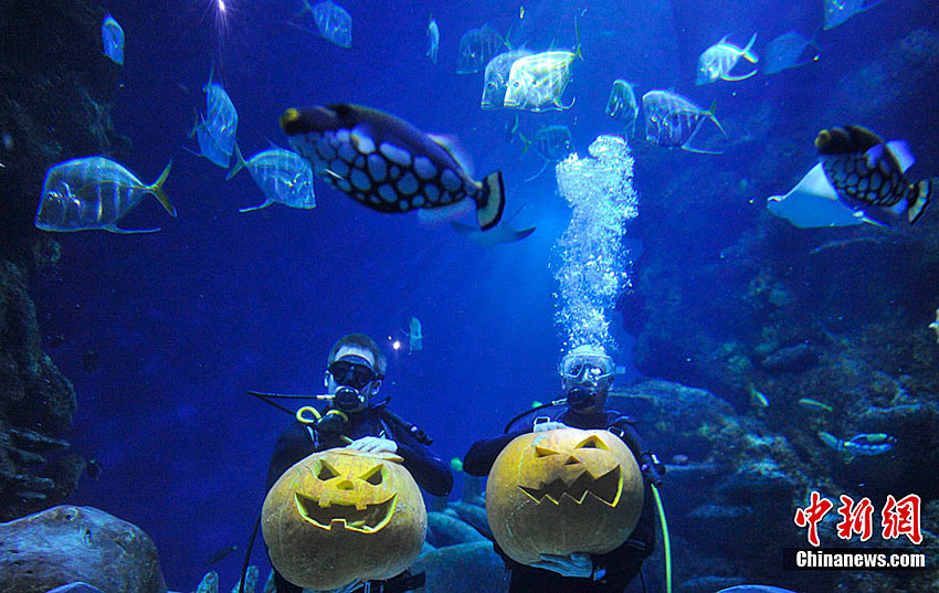 潛水員水下雕南瓜宣傳倫敦水族館萬圣節(jié)活動
