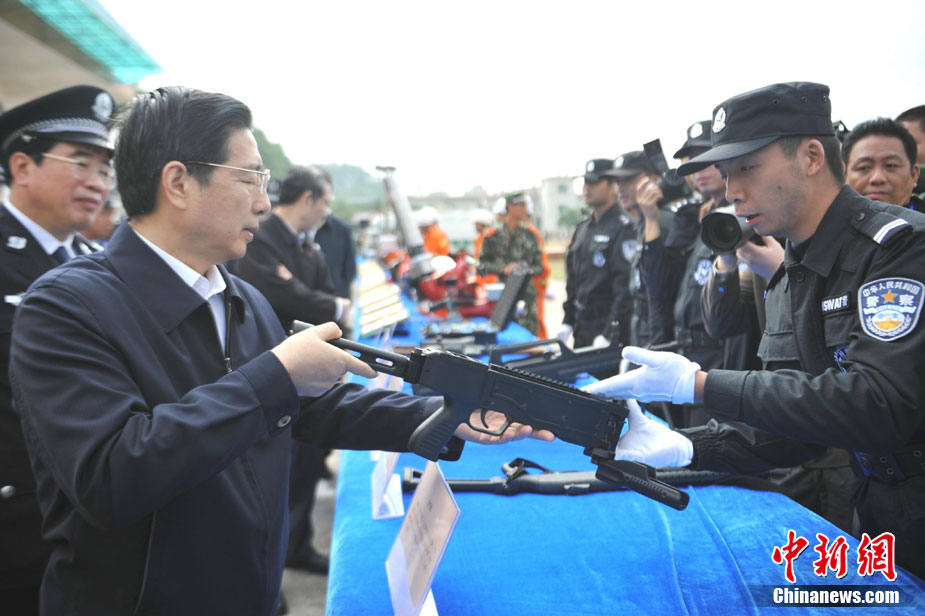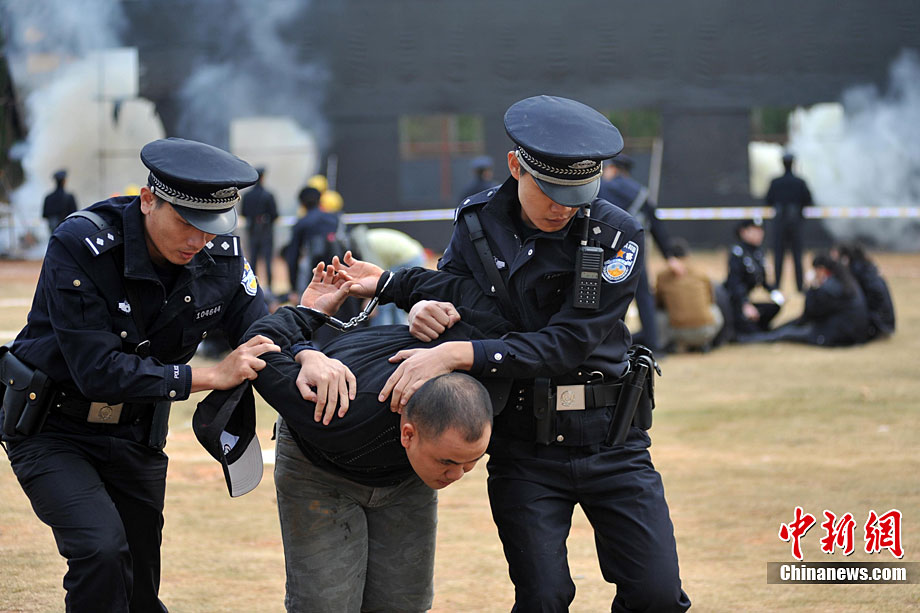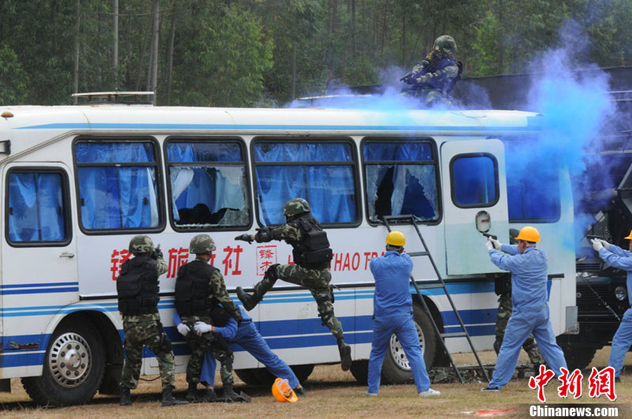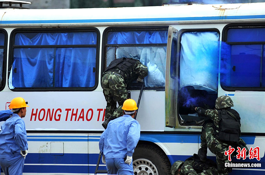 10月28日,廣西舉行亞運(yùn)安保反恐演練。在演習(xí)中,警方采用了多種先進(jìn)反劫持設(shè)備,模擬各種突發(fā)狀況。圖為演練被劫持大巴人質(zhì)解救過(guò)程。廣西共有八條通道通往廣東,是環(huán)粵亞運(yùn)安保的重點(diǎn)地區(qū)之一。中新社記者 蔣雪林 攝