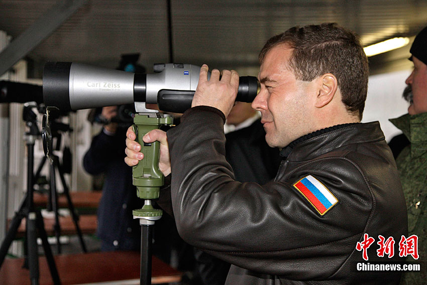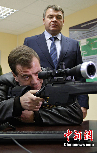 俄總統(tǒng)梅德韋杰夫端槍瞄準 “跟風”普京扮硬漢