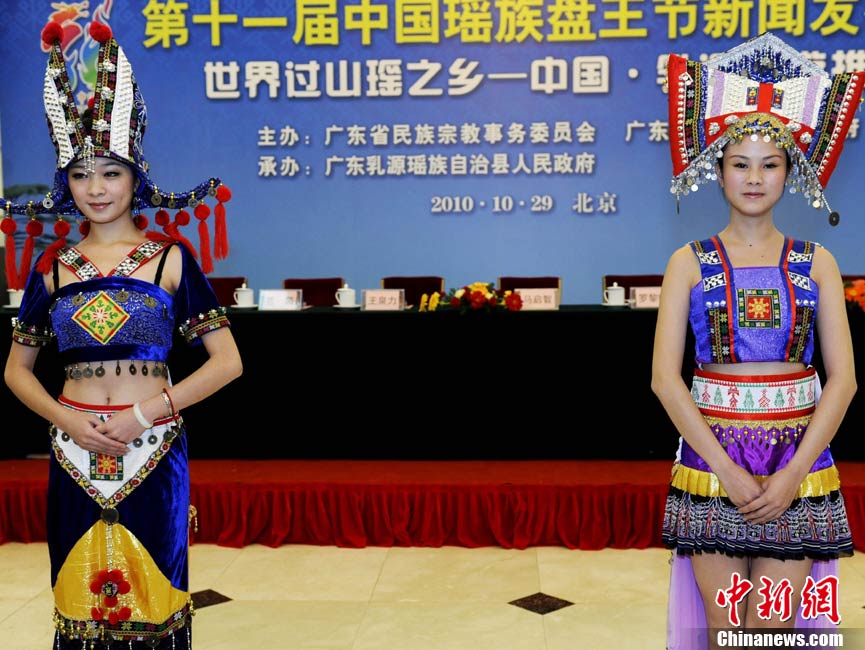 10月29日,第十一屆中國(guó)瑤族盤(pán)王節(jié)新聞發(fā)布會(huì)暨世界過(guò)山瑤之鄉(xiāng)——中國(guó)乳源旅游推介會(huì)在人民大會(huì)堂召開(kāi)。本次會(huì)議發(fā)布,世界瑤族人民的盛會(huì)——第十一屆中國(guó)瑤族盤(pán)王節(jié)將于2010年11月20日至22日在廣東乳源瑤族自治縣隆重舉行。瑤族盤(pán)王節(jié)是瑤族人民紀(jì)念其始祖盤(pán)王(盤(pán)瓠)的盛大節(jié)日。圖為“瑤族公主”形象代表身著湘粵桂南嶺地區(qū)的瑤族盛裝亮相新聞發(fā)布會(huì)。中新社記者 劉震 攝