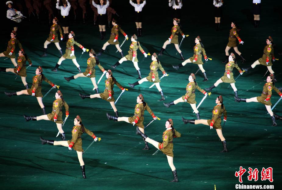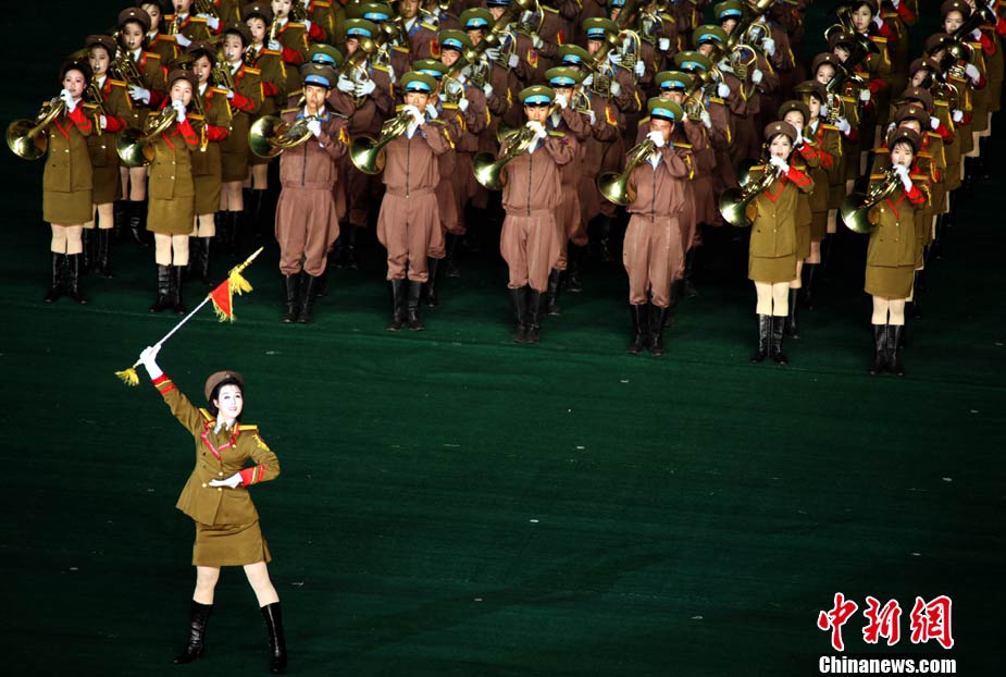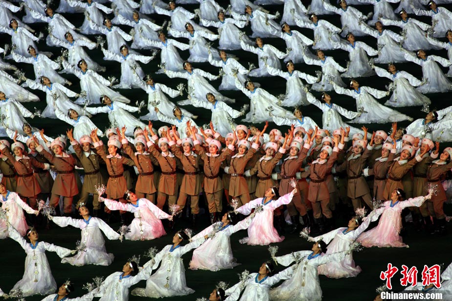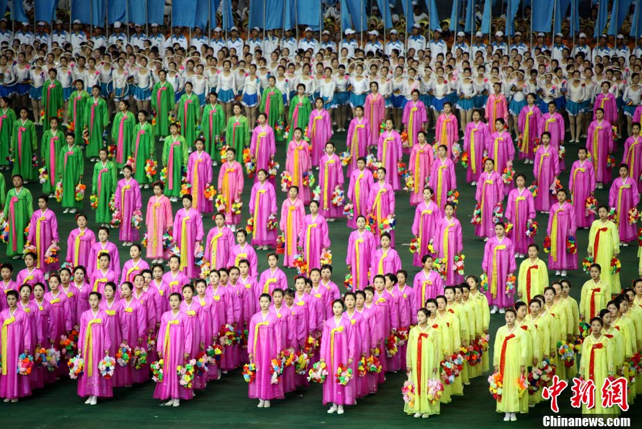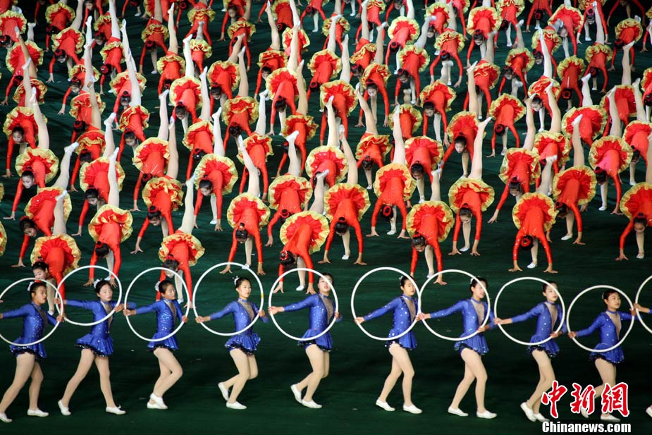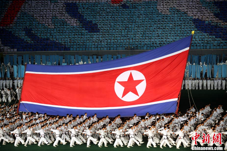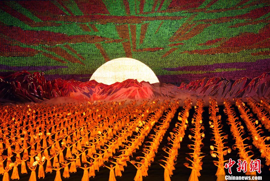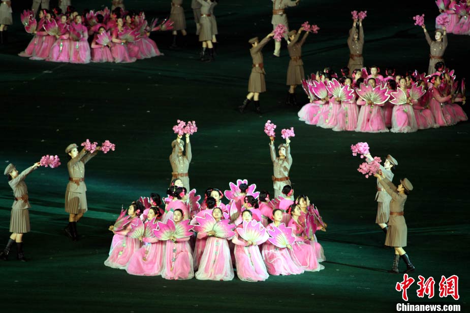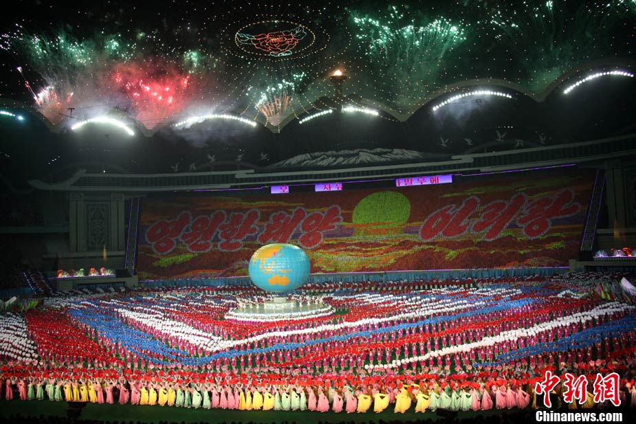 10月23日,朝鮮在平壤“五一”體育場為紀(jì)念中國人民志愿軍入朝參戰(zhàn)60周年舉辦大型團(tuán)體操和藝術(shù)表演《阿里郎》。 中新社記者 孫自法 攝