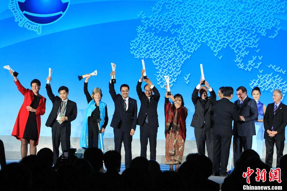 10月30日晚,上海世博會(huì)舉行頒獎(jiǎng)晚會(huì),頒發(fā)“世博會(huì)獎(jiǎng)”、“COSMOS”獎(jiǎng)、“國(guó)展局獎(jiǎng)?wù)隆。“世博?huì)獎(jiǎng)”分為ABCD四類展館和金銀銅等次以及展館設(shè)計(jì)獎(jiǎng)、創(chuàng)意展示獎(jiǎng)、主題演繹獎(jiǎng)。圖為英國(guó)、韓國(guó)、西班牙分別獲得A類展館設(shè)計(jì)獎(jiǎng)金銀銅;沙特、日本、馬來西亞分別獲得創(chuàng)意展示獎(jiǎng)金銀銅;德國(guó)、俄羅斯、法國(guó)分別獲得主題演繹獎(jiǎng)金銀銅。 中新社記者 潘索菲 攝