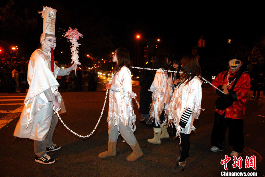 當(dāng)?shù)貢r間10月31日晚,一年一度的紐約萬圣節(jié)前夜狂歡大游行在紐約第六大道舉行,這是全世界最大的萬圣節(jié)游行。中新社記者 孫宇挺 攝