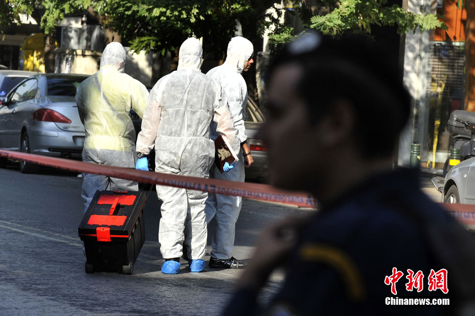 圖為爆炸事件發(fā)生后,希臘警方封鎖了發(fā)生爆炸事件的郵局及周邊地區(qū)。