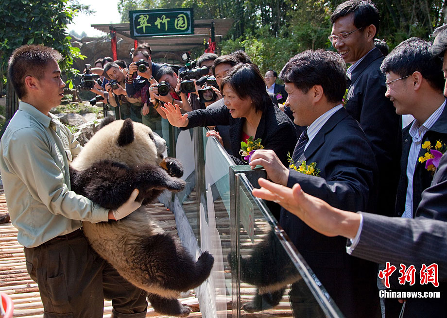 11月2日,在廣州亞運(yùn)會(huì)倒計(jì)時(shí)10天之際,國(guó)家林業(yè)局、廣東省人民政府、廣州亞組委在廣州市香江野生動(dòng)物世界長(zhǎng)隆大熊貓中心舉行了隆重的啟動(dòng)儀式,由12只國(guó)寶熊貓的組成“亞運(yùn)助威團(tuán)”正式與游客見面。袁宏偉 攝 圖片來(lái)源:cnsphoto