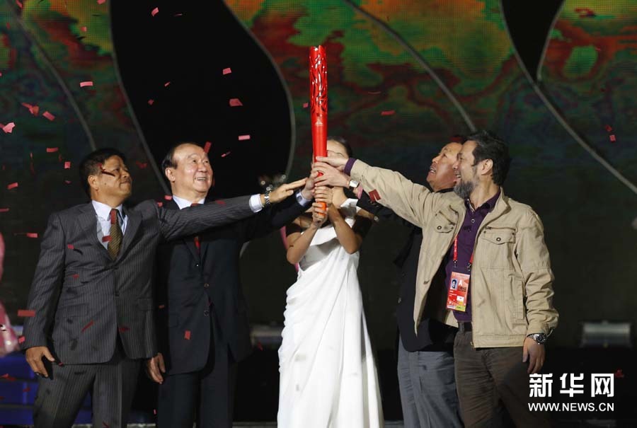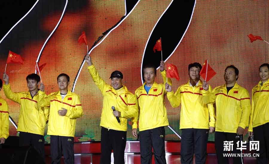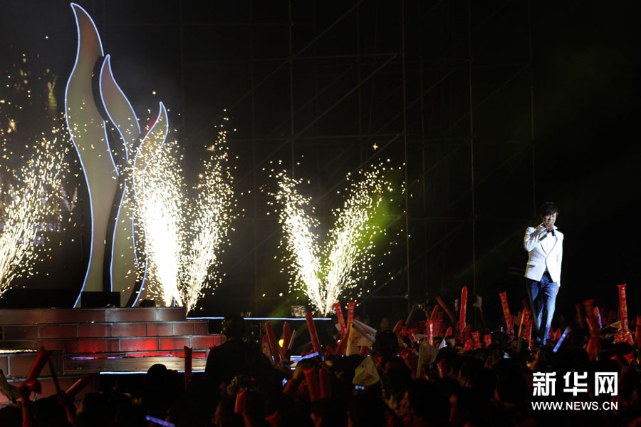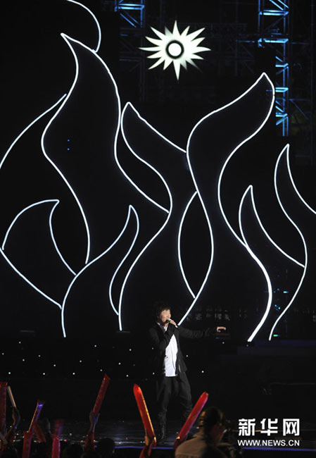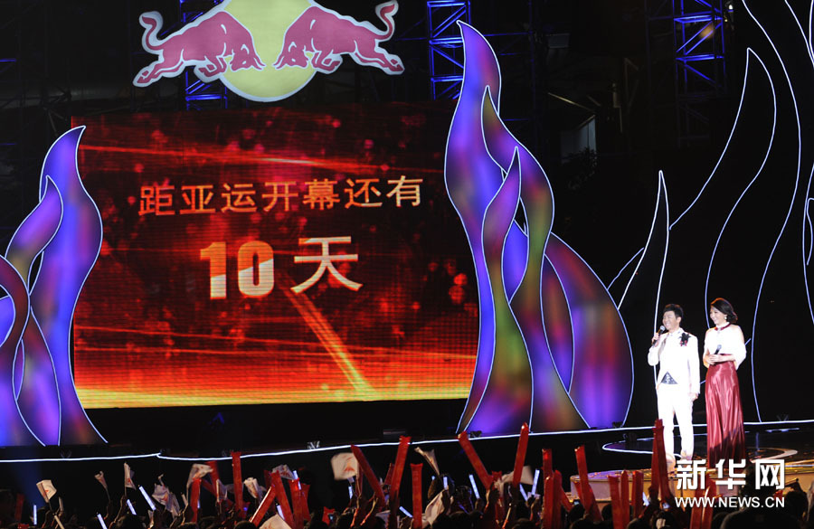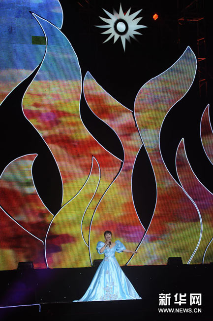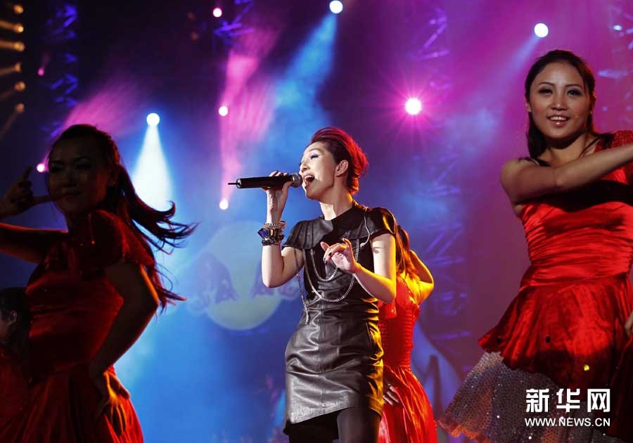 11月2日,歌手楊千嬅(中)在晚會上演唱。當(dāng)日,2010廣州亞運(yùn)會倒計時10天主題歌會在廣州舉行,來自內(nèi)地、香港的明星和中國羽毛球隊一起唱響激情亞運(yùn)。孟永民攝 圖片來源:新華網(wǎng)