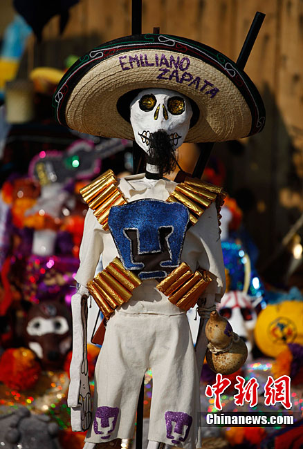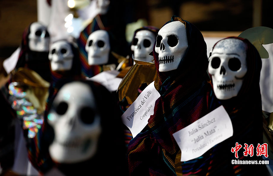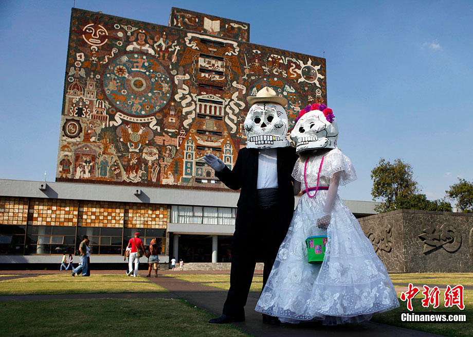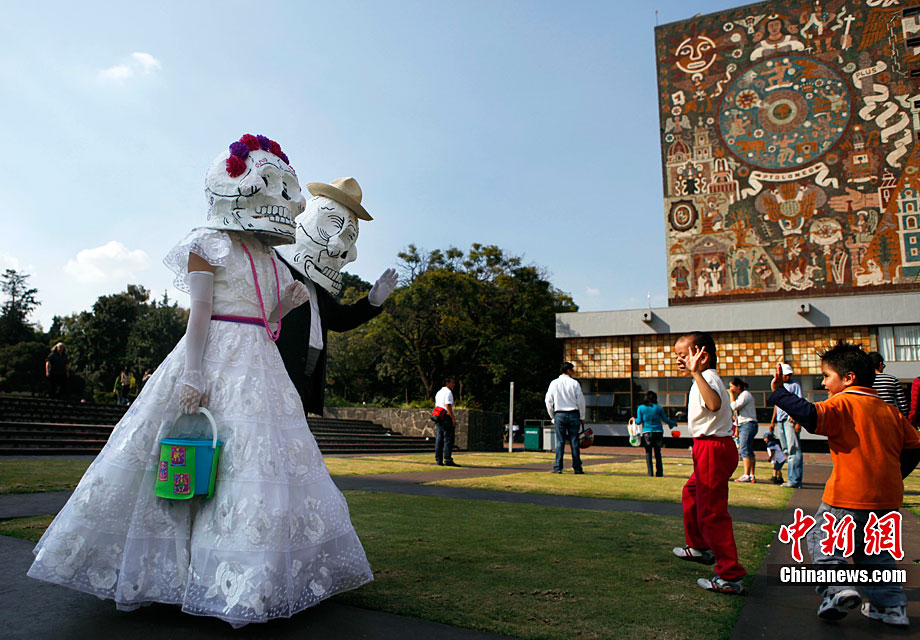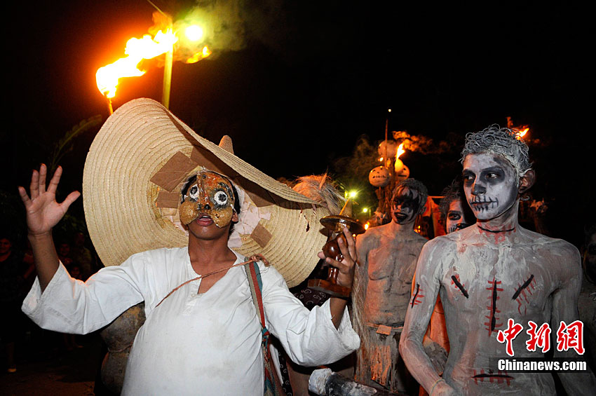當(dāng)?shù)貢r(shí)間11月2日,拉丁美洲各國(guó)紛紛迎來(lái)傳統(tǒng)節(jié)日——亡靈節(jié)。按照當(dāng)?shù)仫L(fēng)俗,11月1日是“幼靈”節(jié);2日是“成靈”節(jié)。人們?cè)谀沟赝ㄍ迩f或者小鎮(zhèn)的路上撒了黃色的花瓣,讓亡靈循著芬芳的小路歸來(lái)。晚間,在家門(mén)口點(diǎn)上南瓜燈籠,為亡靈上門(mén)引路;在祭壇上擺著玉米羹、巧克力、面包、粽子、辣醬、南瓜、甜食、甜點(diǎn)等供品,讓亡靈享用。節(jié)日里,無(wú)分男女老幼,都可以戴著面具,穿上印著白骨的鬼怪衣服,在街上招搖過(guò)市,表示亡靈歸來(lái)。 圖為墨西哥民眾慶祝亡靈節(jié)。
