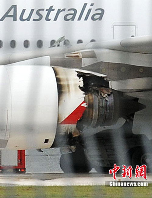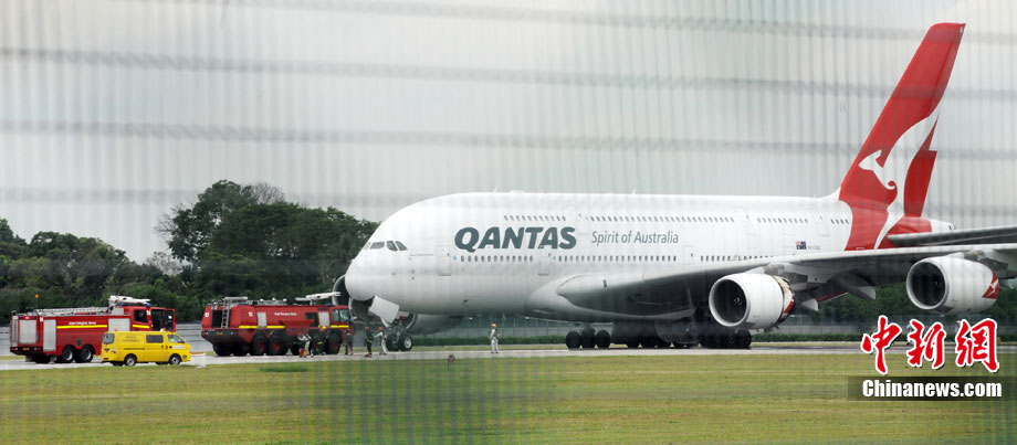 11月4日,澳大利亞航空公司否認該公司一架飛機墜毀的消息,稱該架飛機是引擎出現(xiàn)故障,已經(jīng)在新加坡機場緊急降落。據(jù)悉,澳大利亞航空公司一架航班號為QF32的空客A380客機引擎出現(xiàn)故障,被迫關閉了4個引擎中的1個,于當?shù)貢r間4日中午12時左右在新加坡機場實施降落。圖為發(fā)生故障的澳航客機停在新加坡機場。
