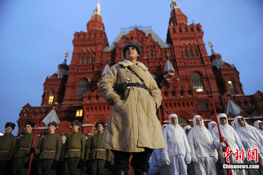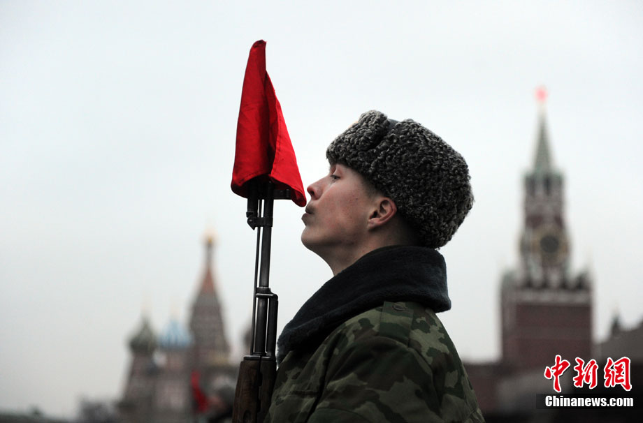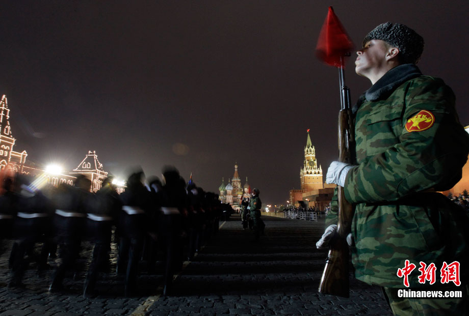 11月3日,準備參加紅場閱兵的士兵在俄羅斯首都莫斯科進行彩排。11月7日俄羅斯將在莫斯科紅場舉行盛大閱兵儀式,紀念1941年11月7日的紅場閱兵69周年。